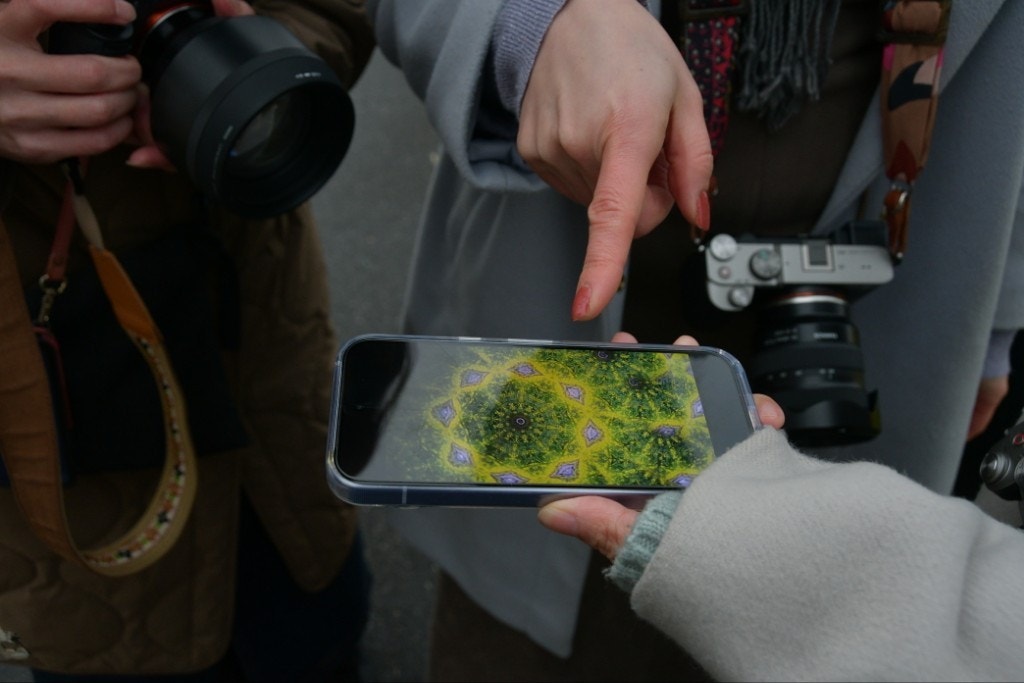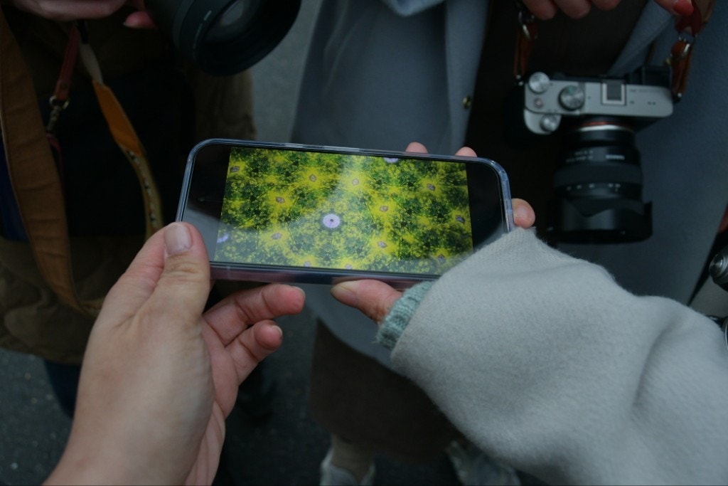 こちらは、先ほどの万華鏡ギャラリーミュージアムで、やまぴーさんが購入された見た景色が万華鏡になるモノで映した世界です。緑と黄色のカラフルな画に、一同スゴいって盛り上がりました!