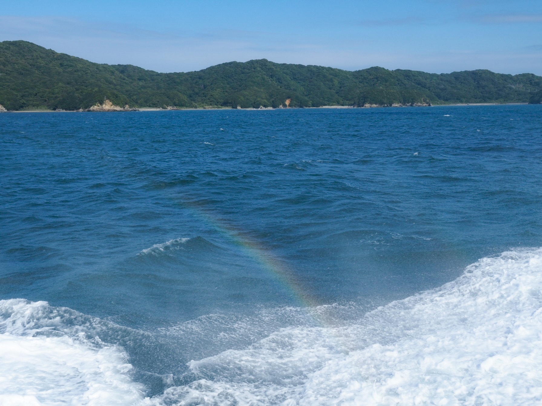 デッキではものすごい水しぶきと揺れに見舞われました。水しぶきに日が当たって虹ができるぐらい。