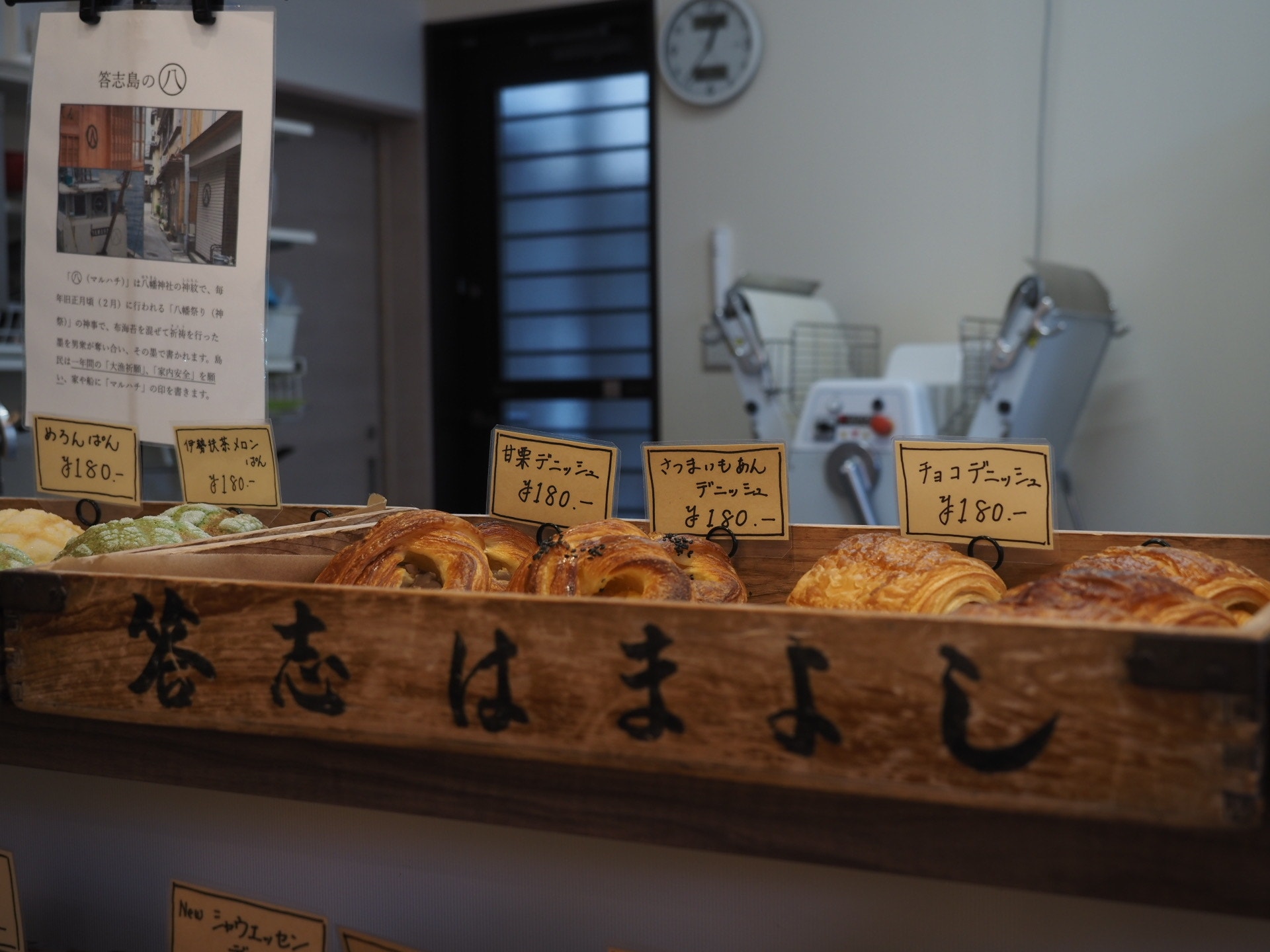 伊勢抹茶のメロンパンや、答志島ではおなじみ「マル八」マークが焼き印となっているあんぱんなど、この地ならではの商品も揃っていました。