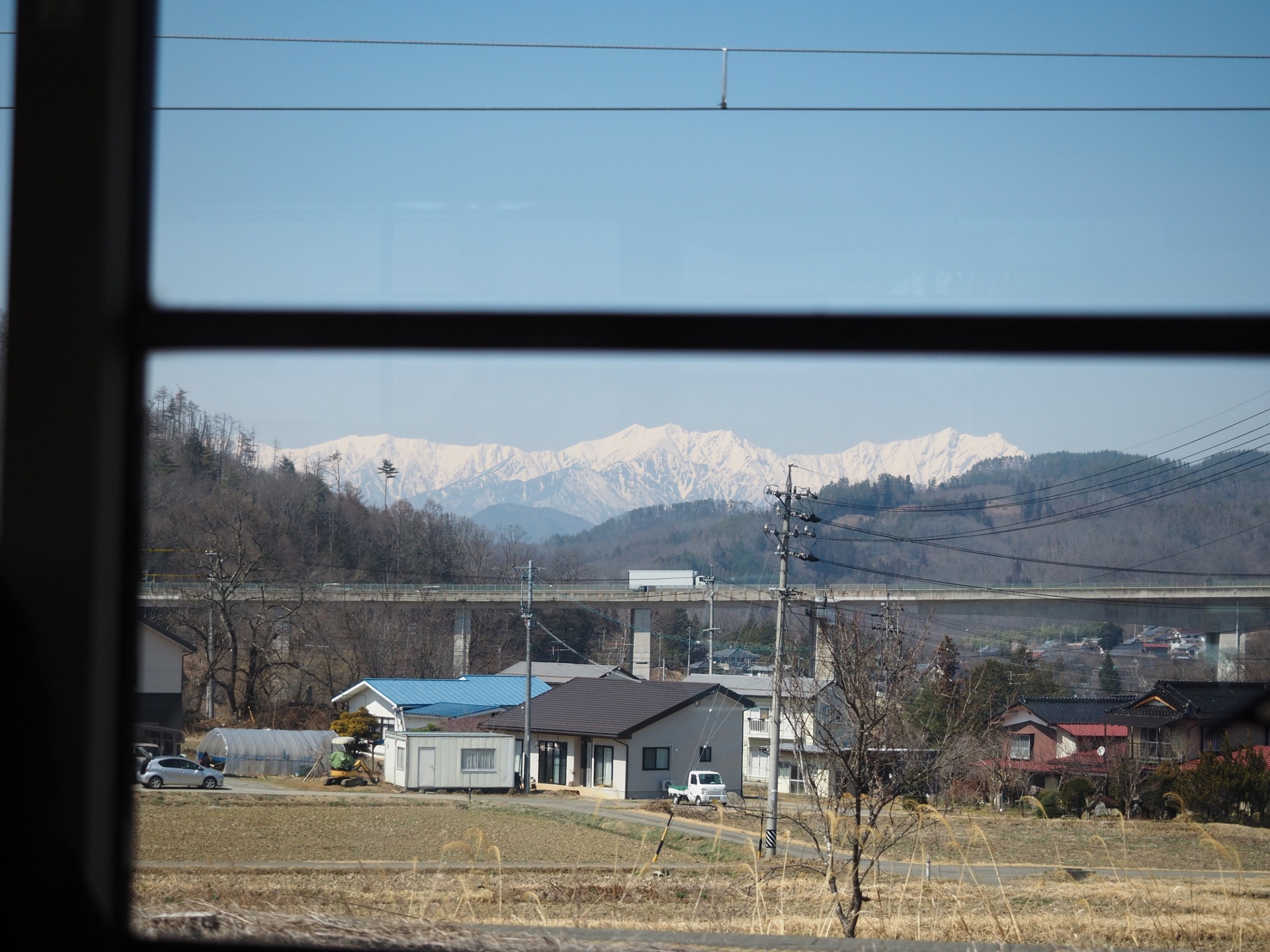 姨捨駅を過ぎると、山を越えて北アルプスの見える車窓に変わっていきました。雪山がきれい…!