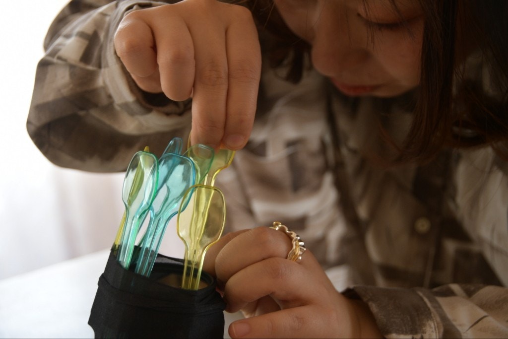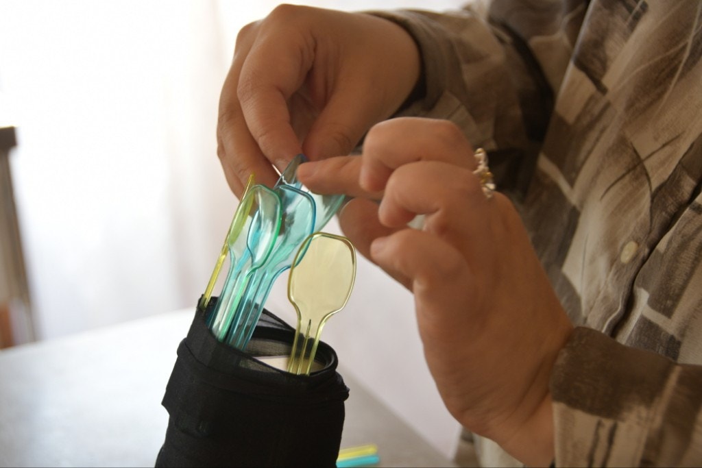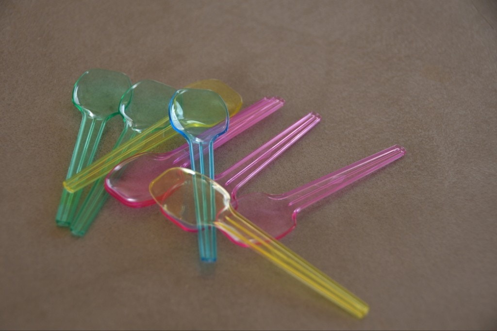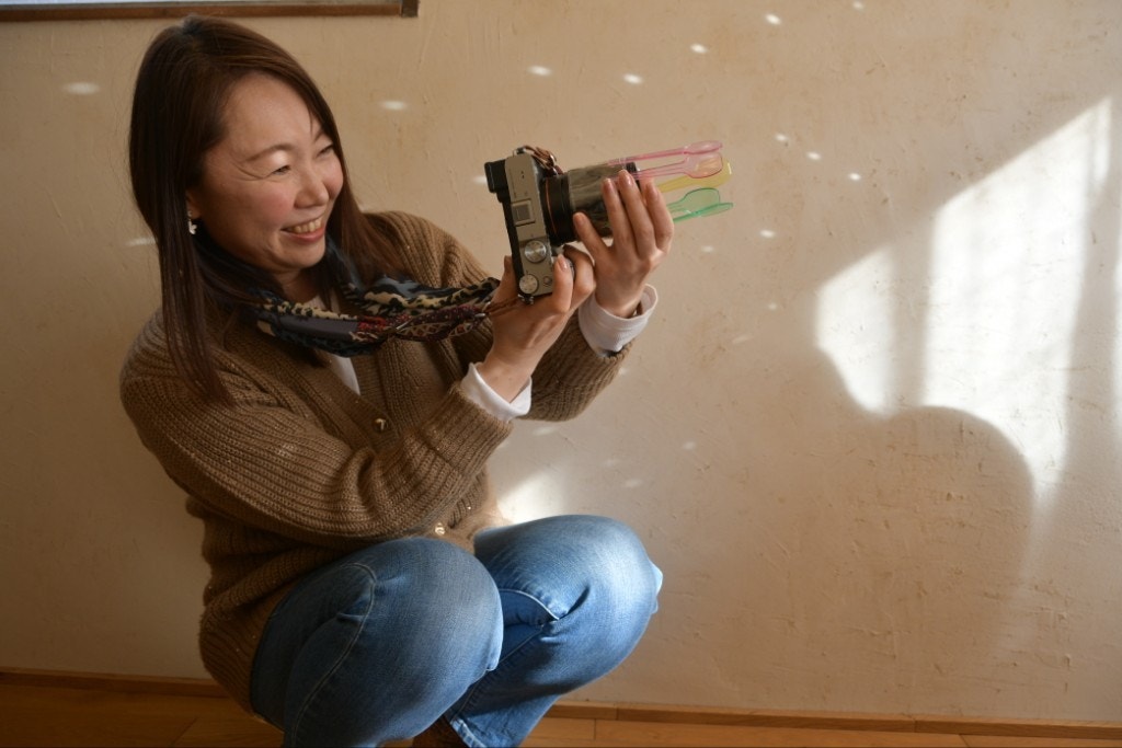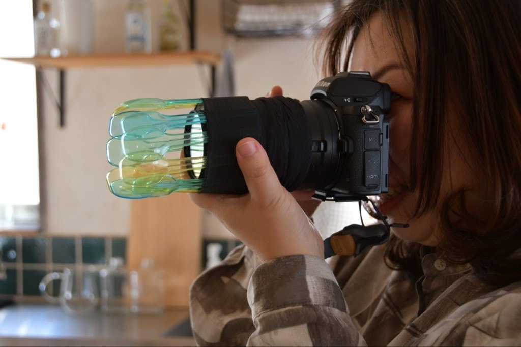 このカラフルなプラスチックのスプーンを、まるで剣山に花を挿すような感覚で(笑)、レンズにスタイリングします。