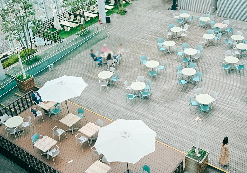 大きな吹き抜けエリア『天空庭園』では、まったりティータイムも。