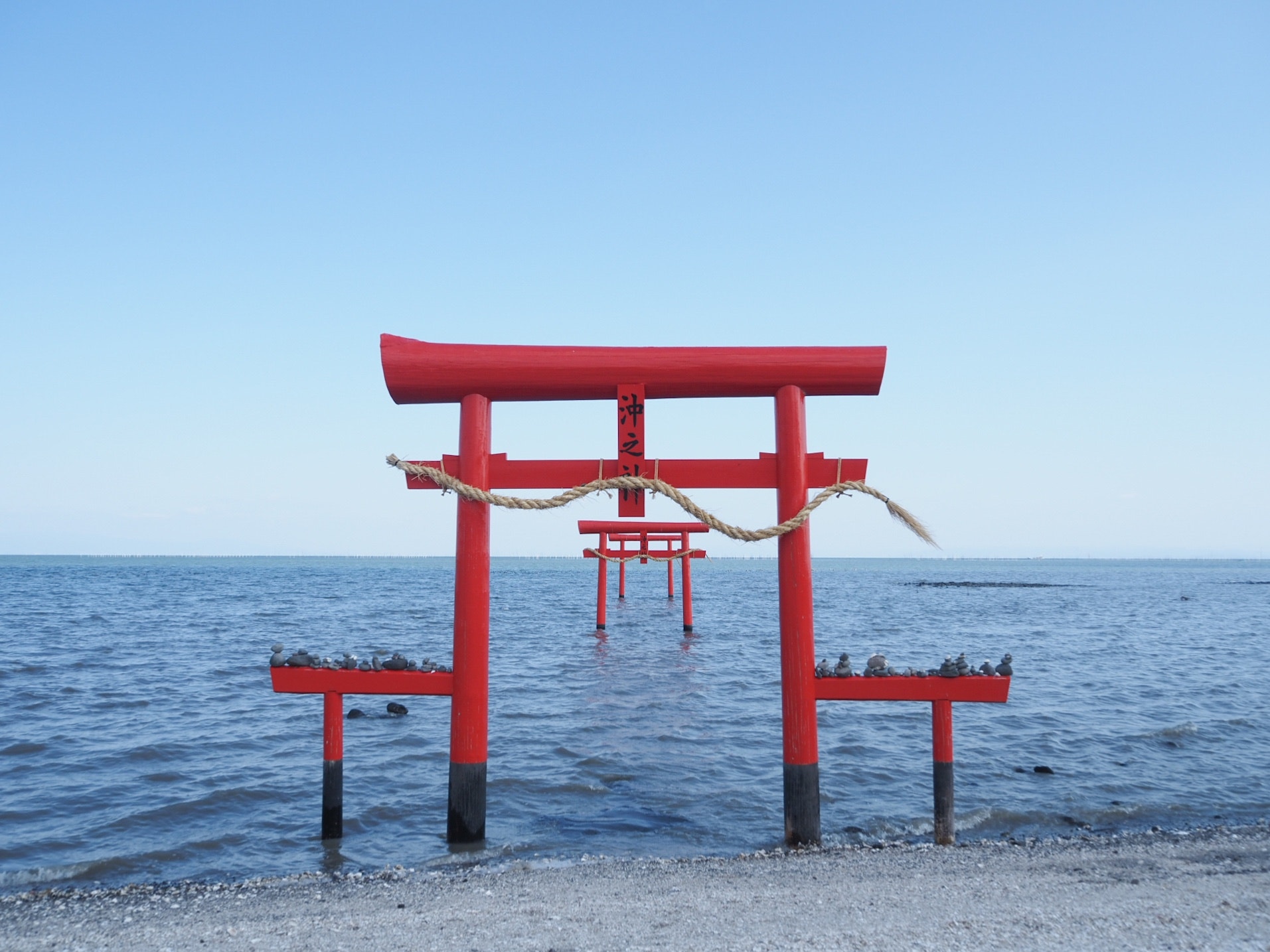 干満差の大きいこの地にある鳥居は、満潮時には海の中に浸かり、干潮時には歩いて鳥居まで行くことができるという異なる姿を見せるのです。