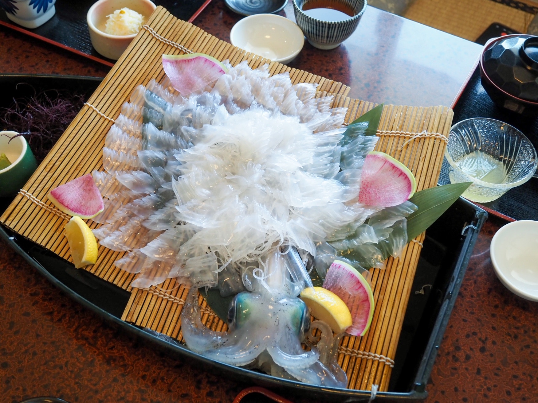 本土に戻ってきてイカの活造りをいただきます。