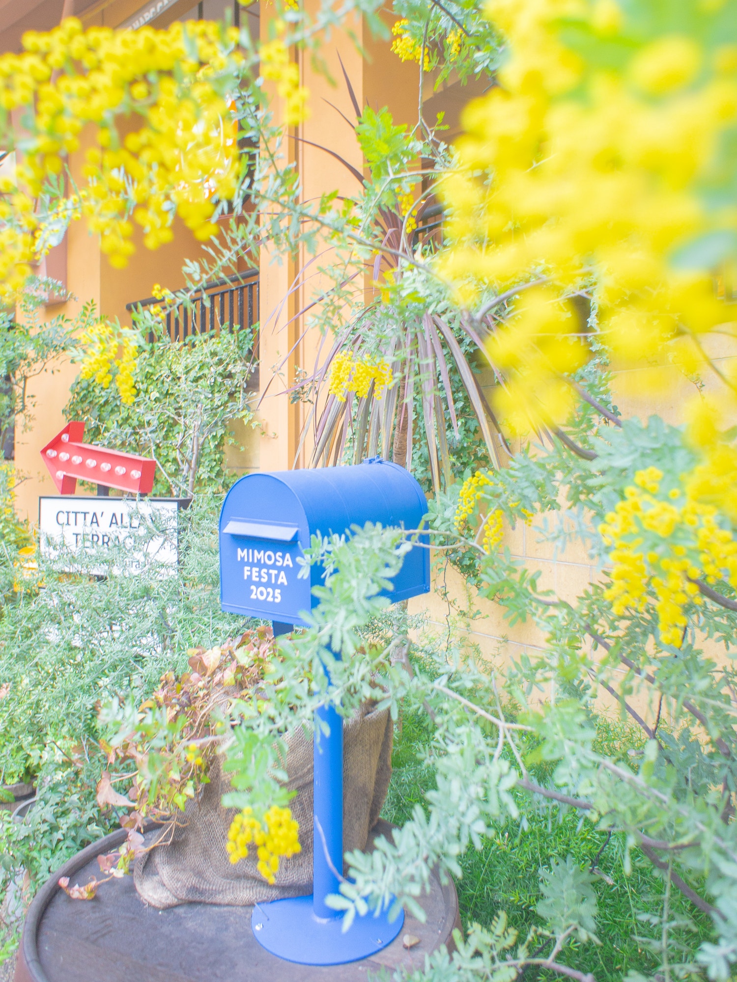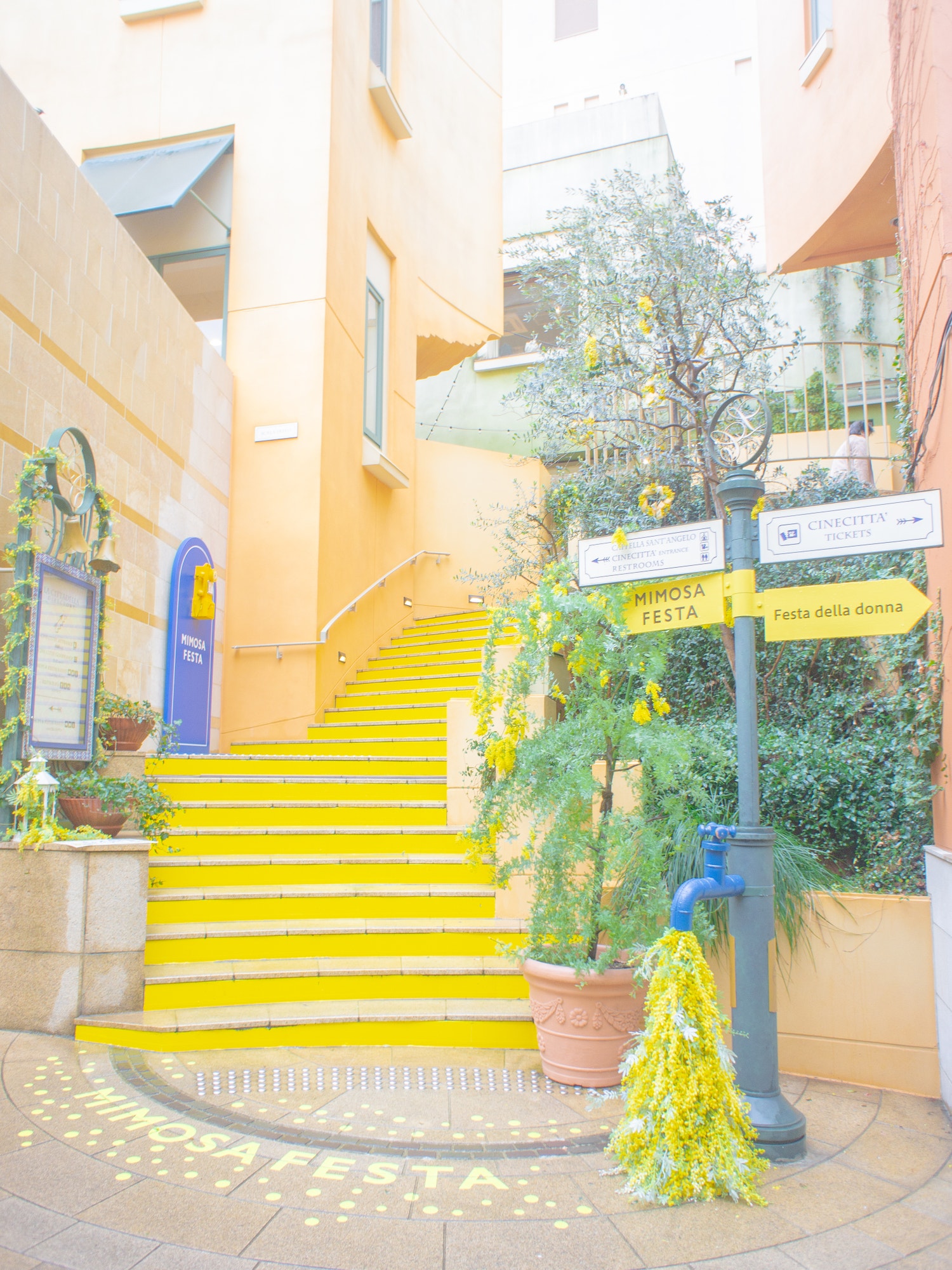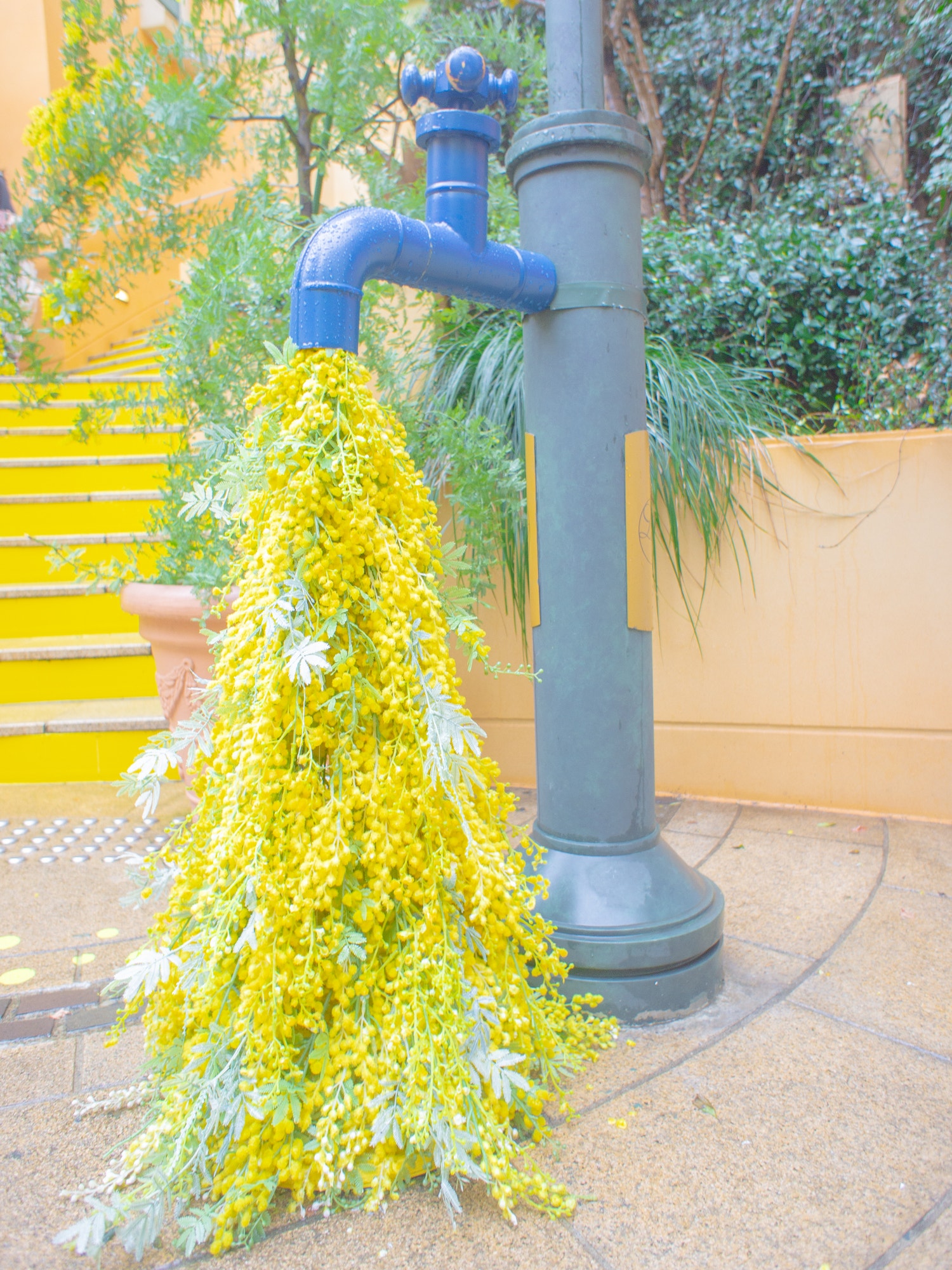 おしゃれなポストや黄色い電話、蛇口からミモザが流れ落ちていたり…