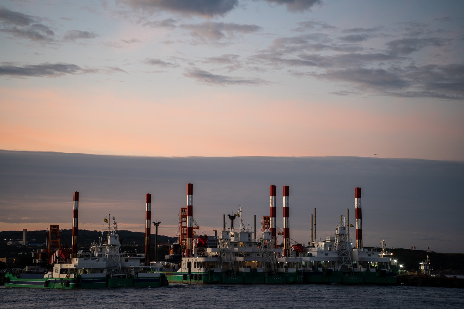 夜が明け始めてきました。空がピンク色に染まり始めてとてもきれいです。並んでいるものが好きな私は赤と白の煙突?が並んでいるのがツボでした。