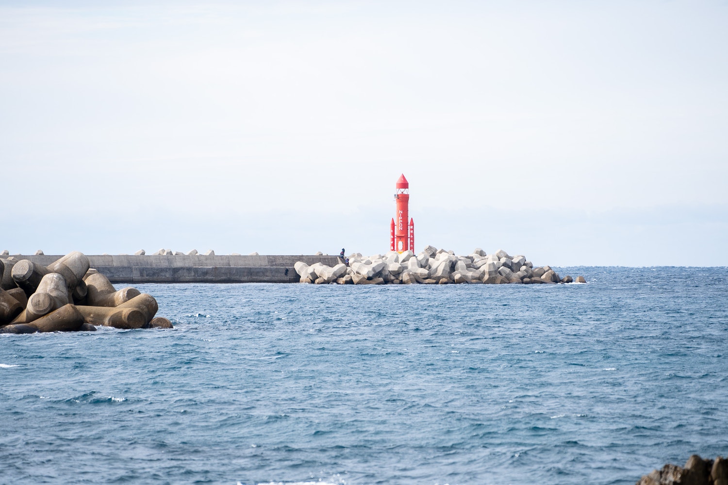ちょっと離れた海岸からも、赤いロケット型の灯台は目立ちますね。