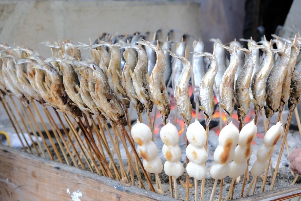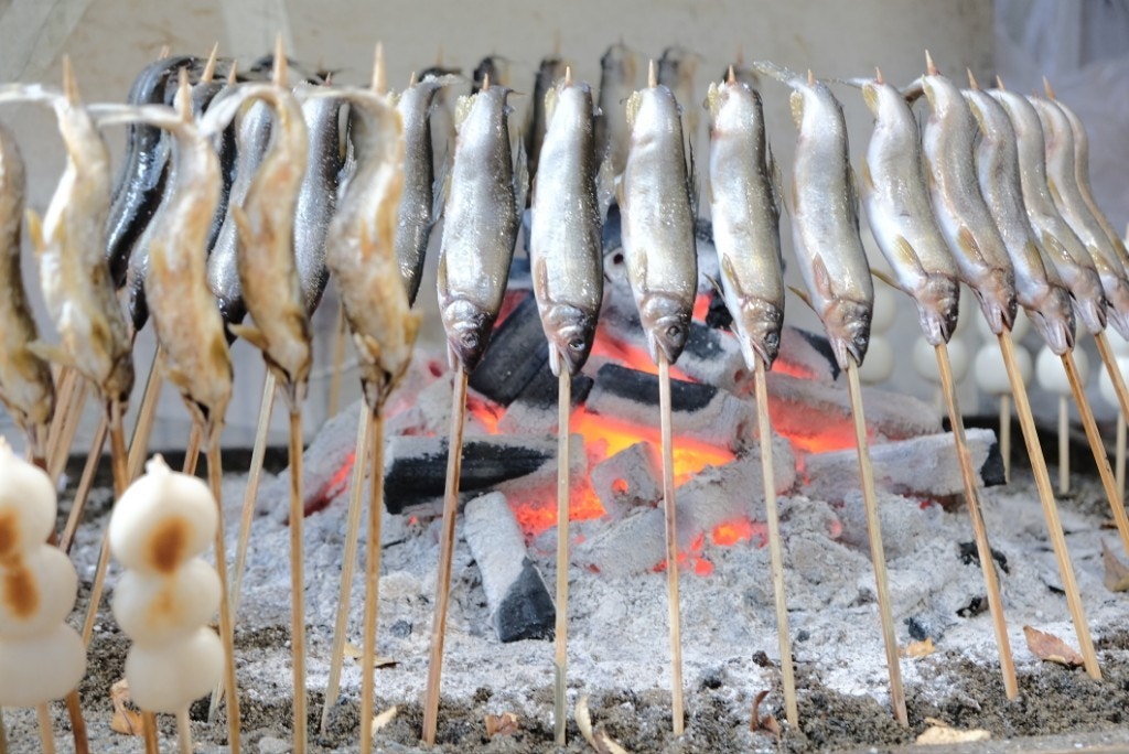 炭火焼きの揚げまんじゅうや鮎の塩焼きなども…