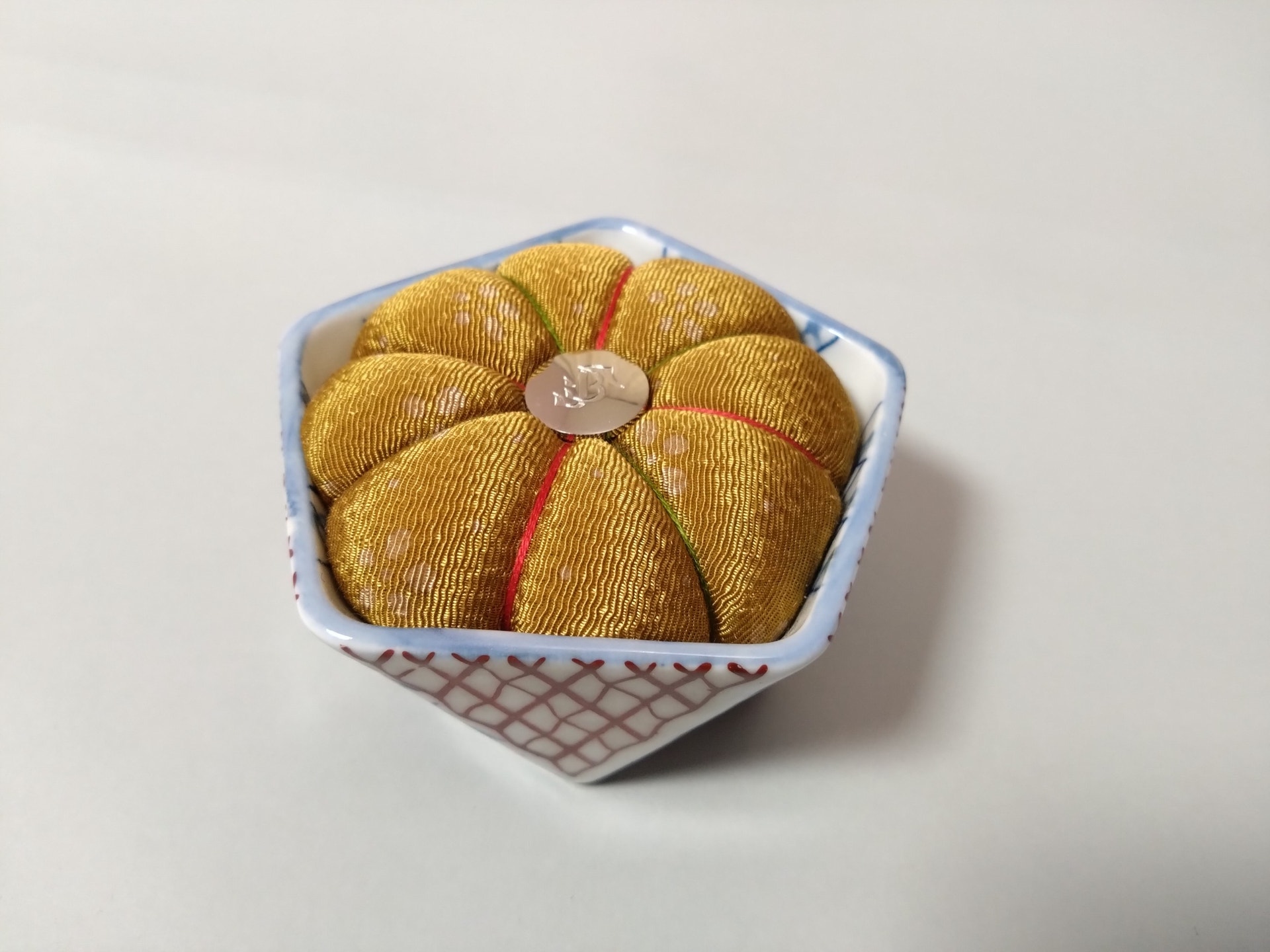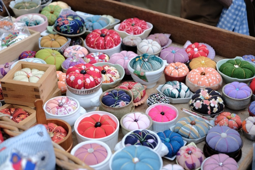 店主のお母様が考案したハンドメイド商品の針刺しです。陶器やレンゲ、枡や桶の器に、色とりどりのハギレ布とボタンやビーズで作った一点物。