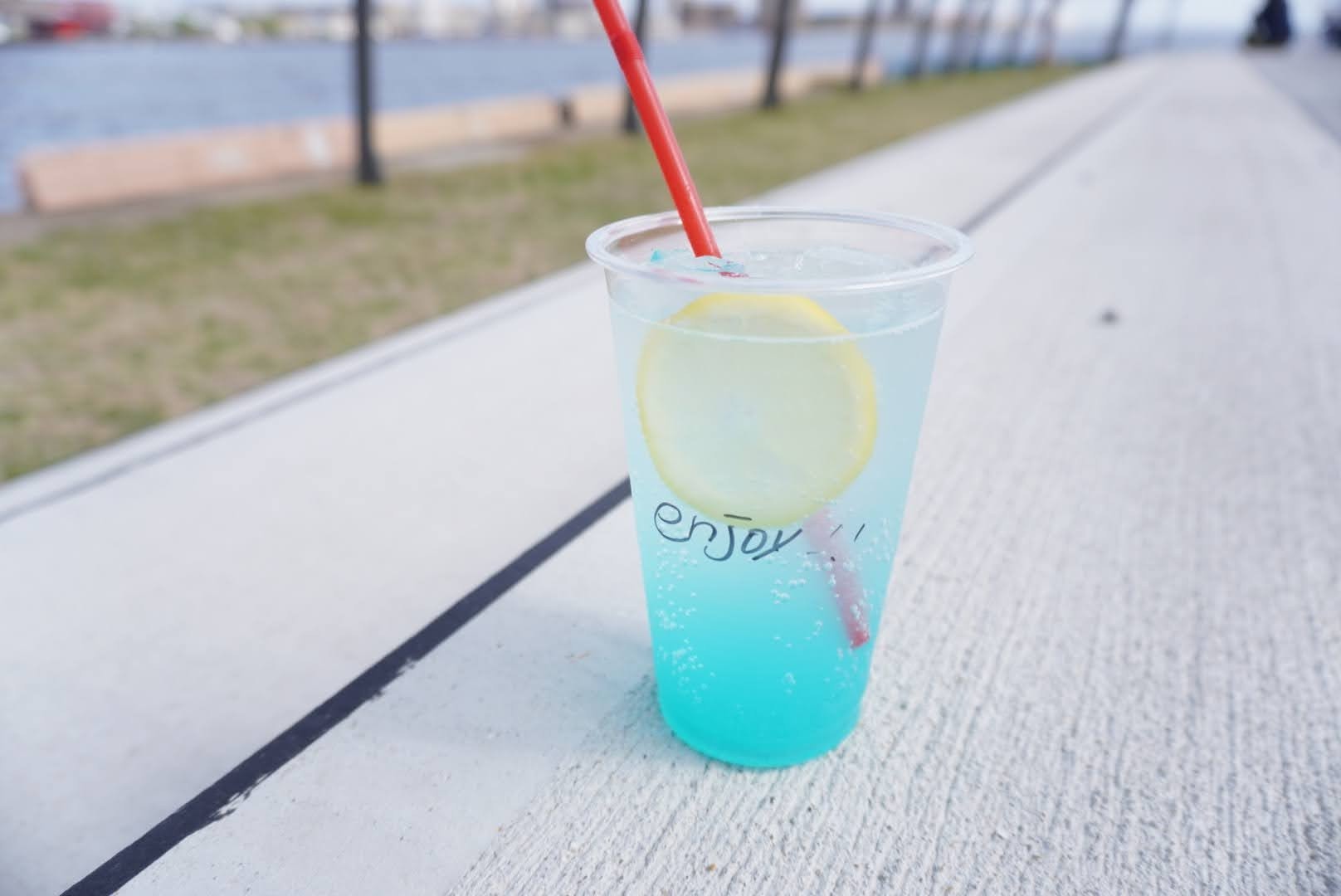 レモンサイダーを飲みながら、遠くに見えるポートアイランドを眺め、