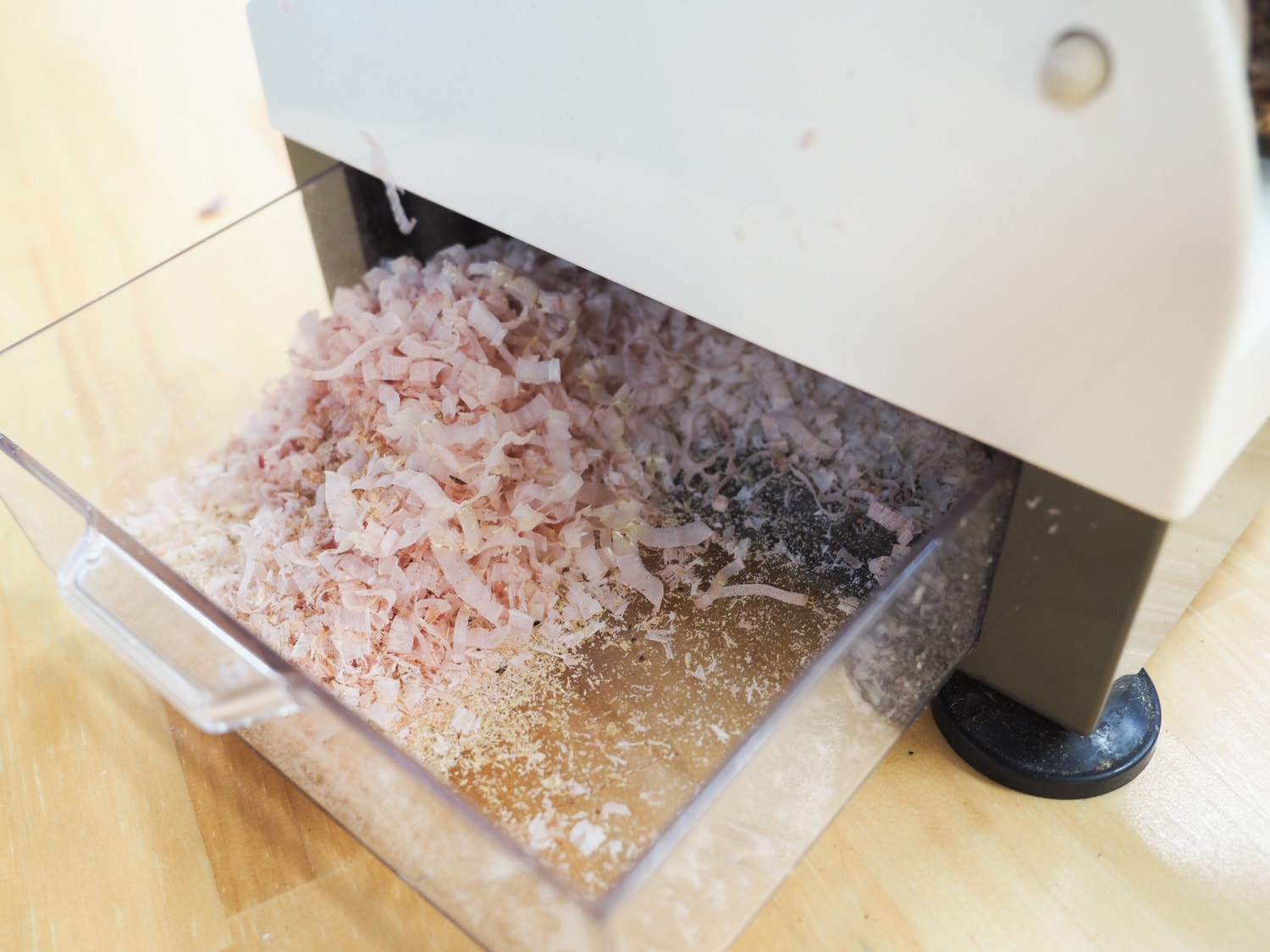 鰹と削り機がだんだんフィットしてきて、それっぽいのが削れてきたところで削り体験終了。