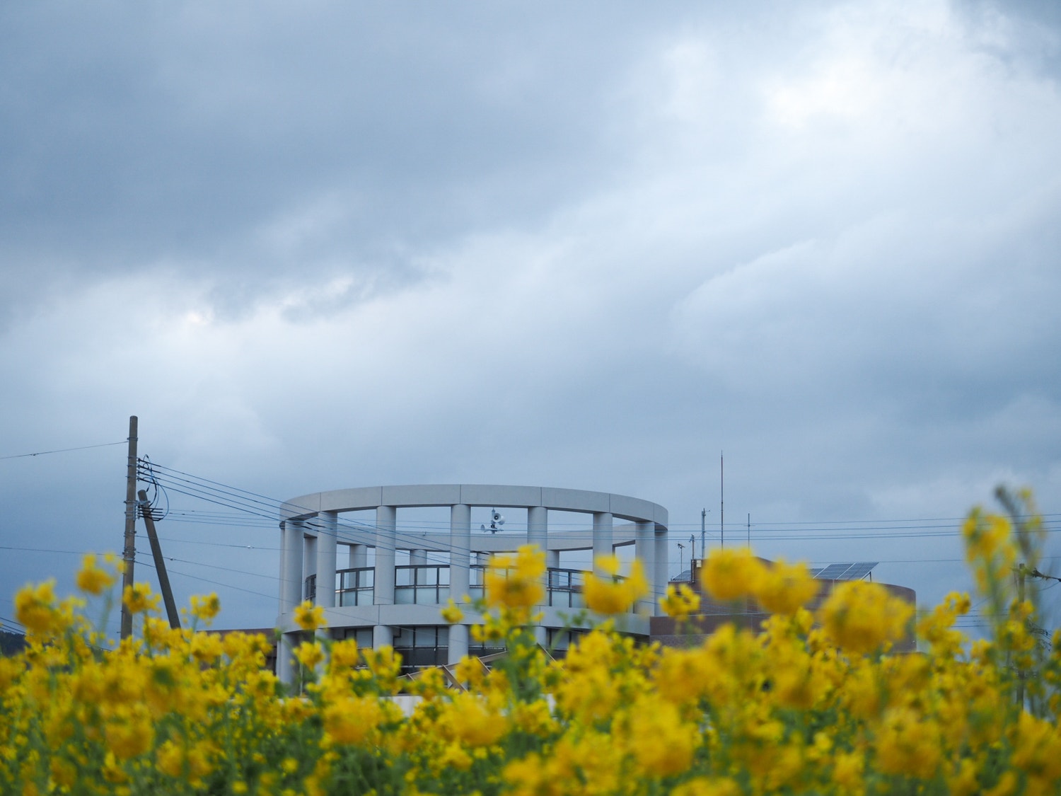 菜の花越しに見えている謎の建物は博物館。縄文時代の遺跡について学べるそうですよ。