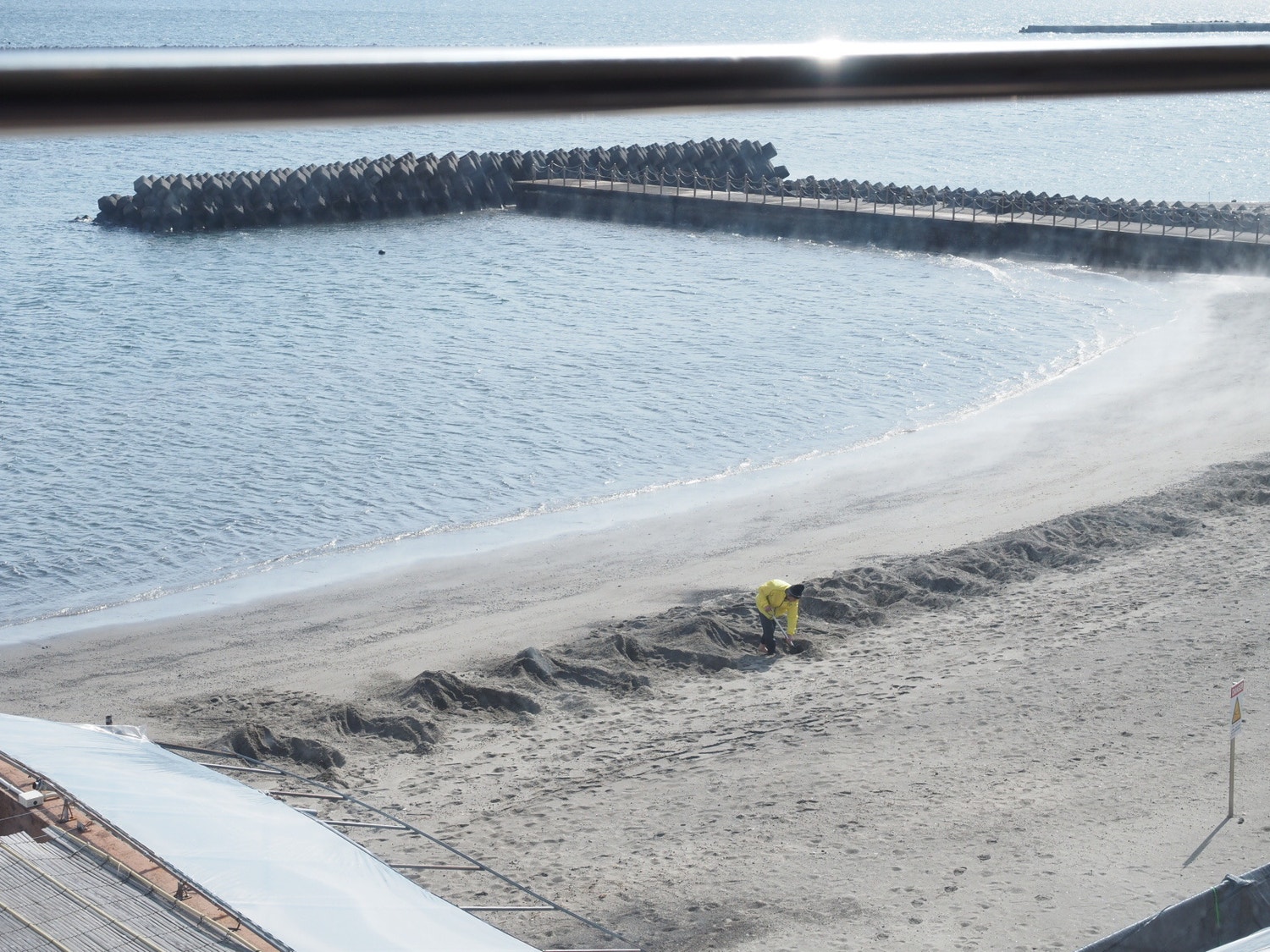 干潮時は屋根のない砂浜で体験できるらしく、準備している様子が見られました。