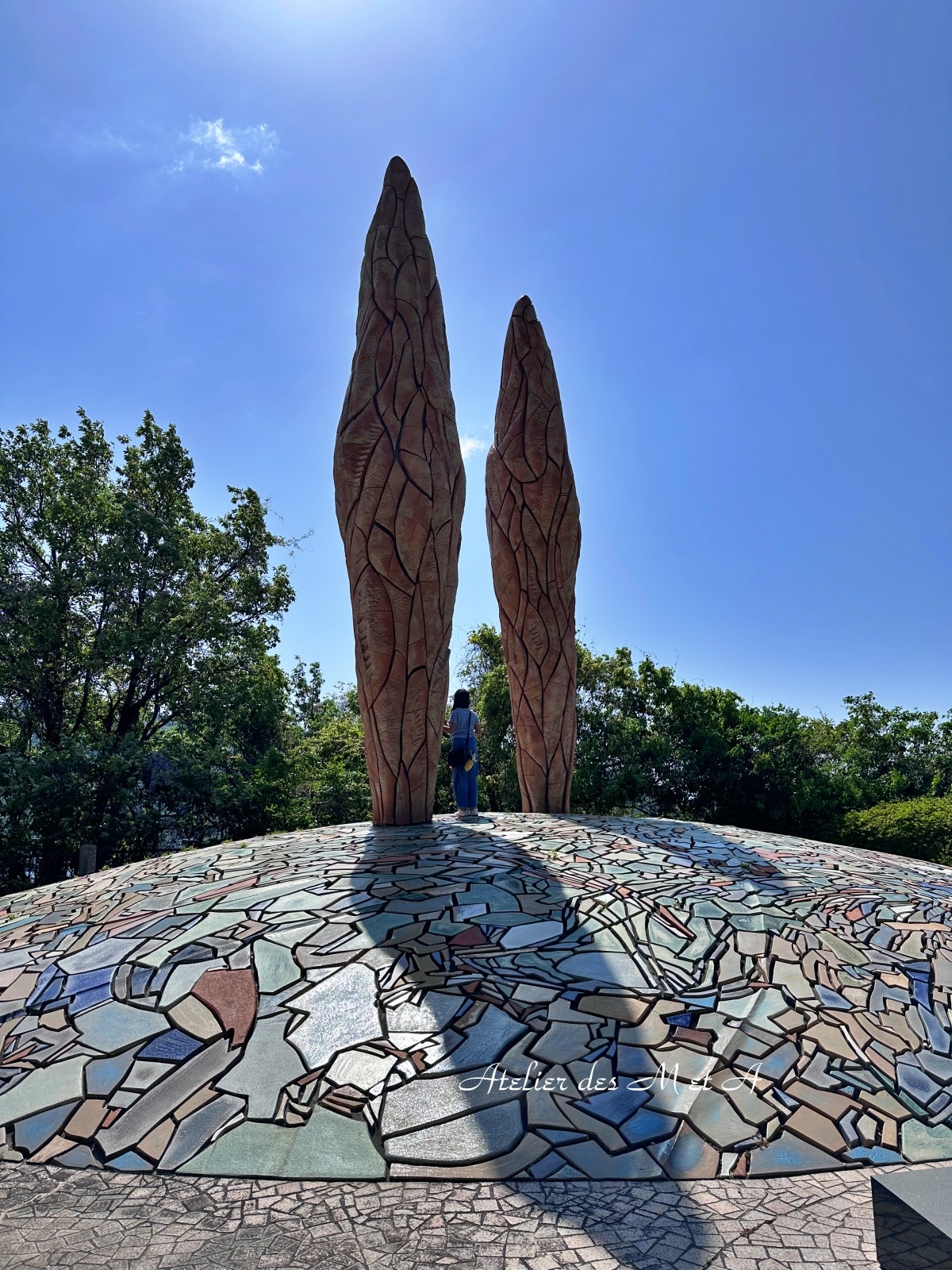 安芸灘大橋を渡ると、すぐに見えてくる不思議な形をしたオブジェがそびえる白崎園。