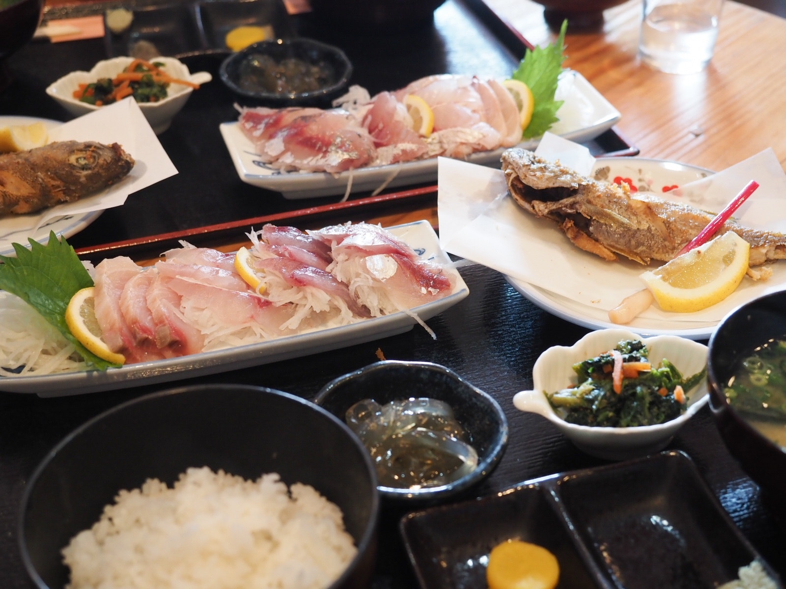 この旅でまだ海鮮を食べていなかったので、ランチではお造りと魚のから揚げのどちらも楽しめる定食を。