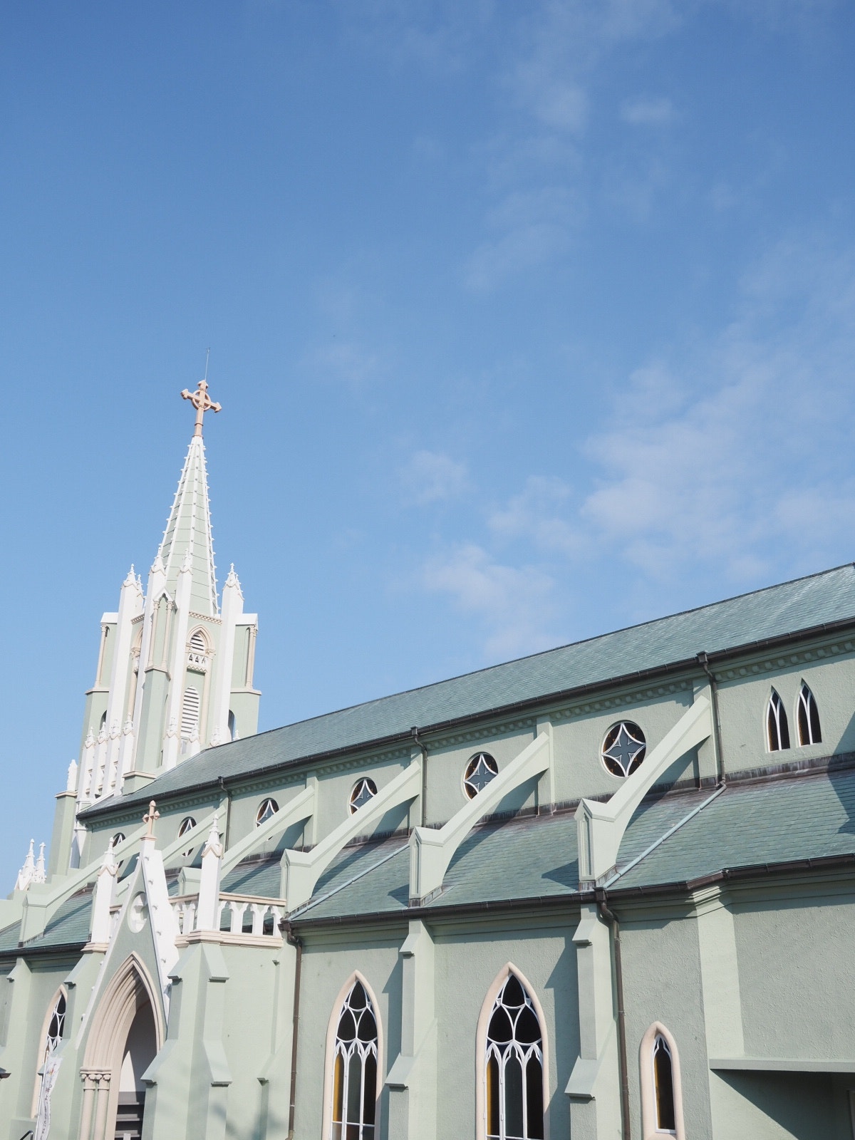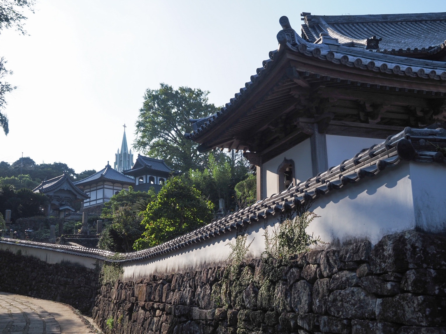 教会の近くにはお寺もいくつかあって、近くの道からはお寺と教会が同時に見られるんです。日本の中でもキリシタンの多かった地域ならではの光景。