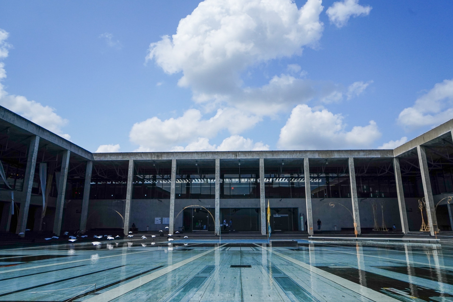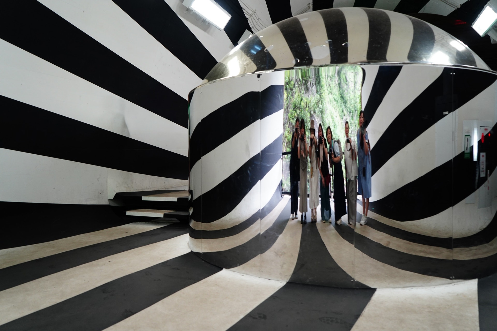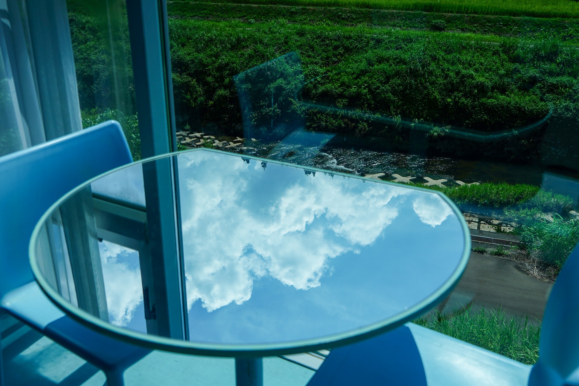 建物の中から見ると、建物と空がリフレクションで写っているように見えるアート。