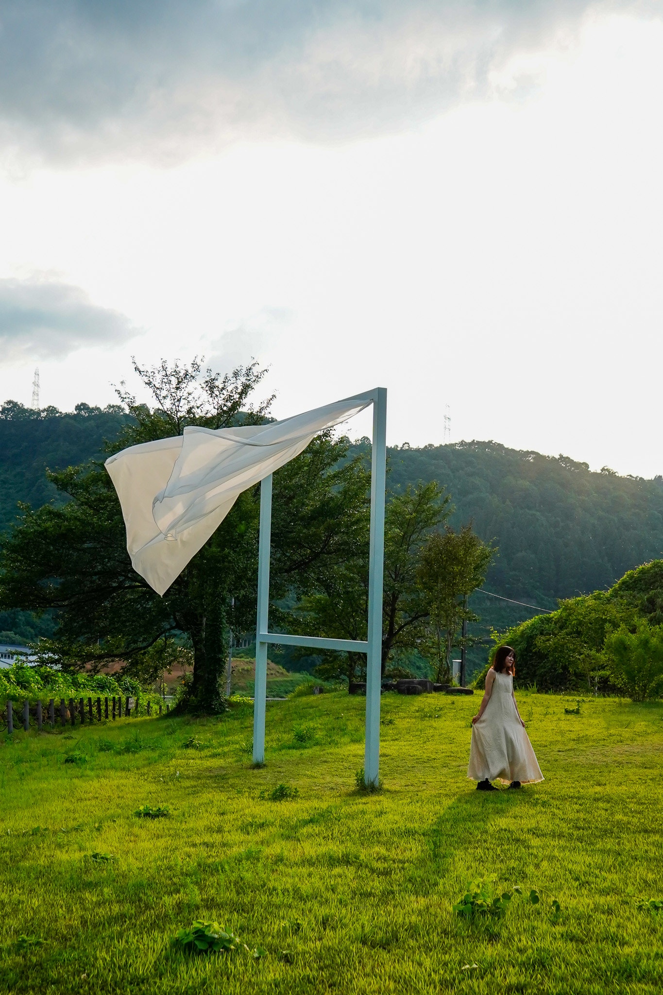 窓から見える風景を通して外に広がる妻有の風景をもう一度発見するための窓。揺れるカーテンは風を映す。と。