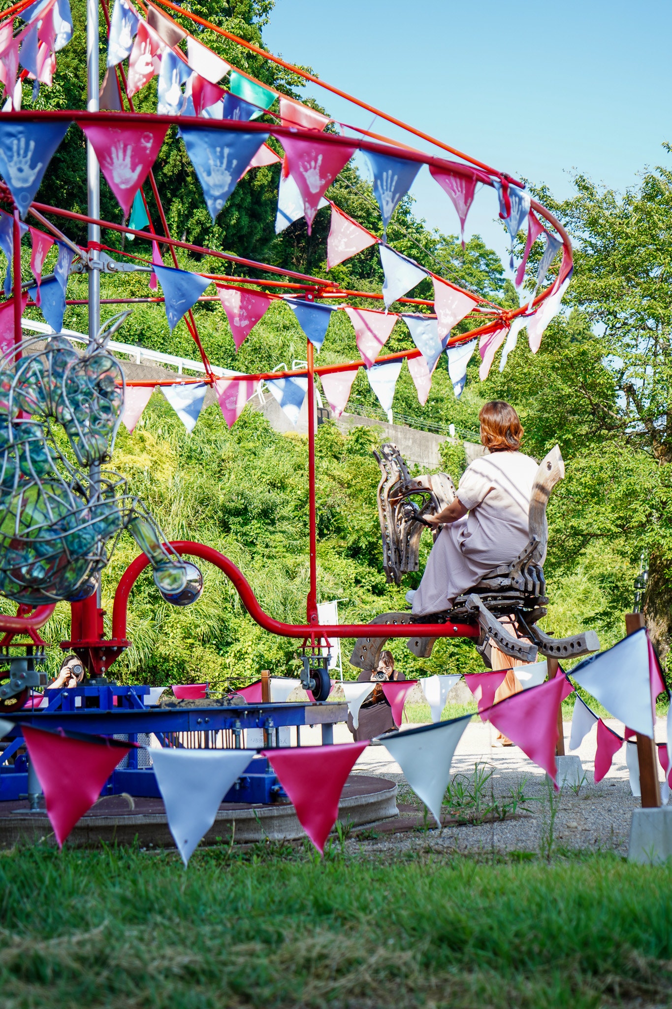 校庭には、手動のメリーゴーランド。かなりシュールな光景でした。