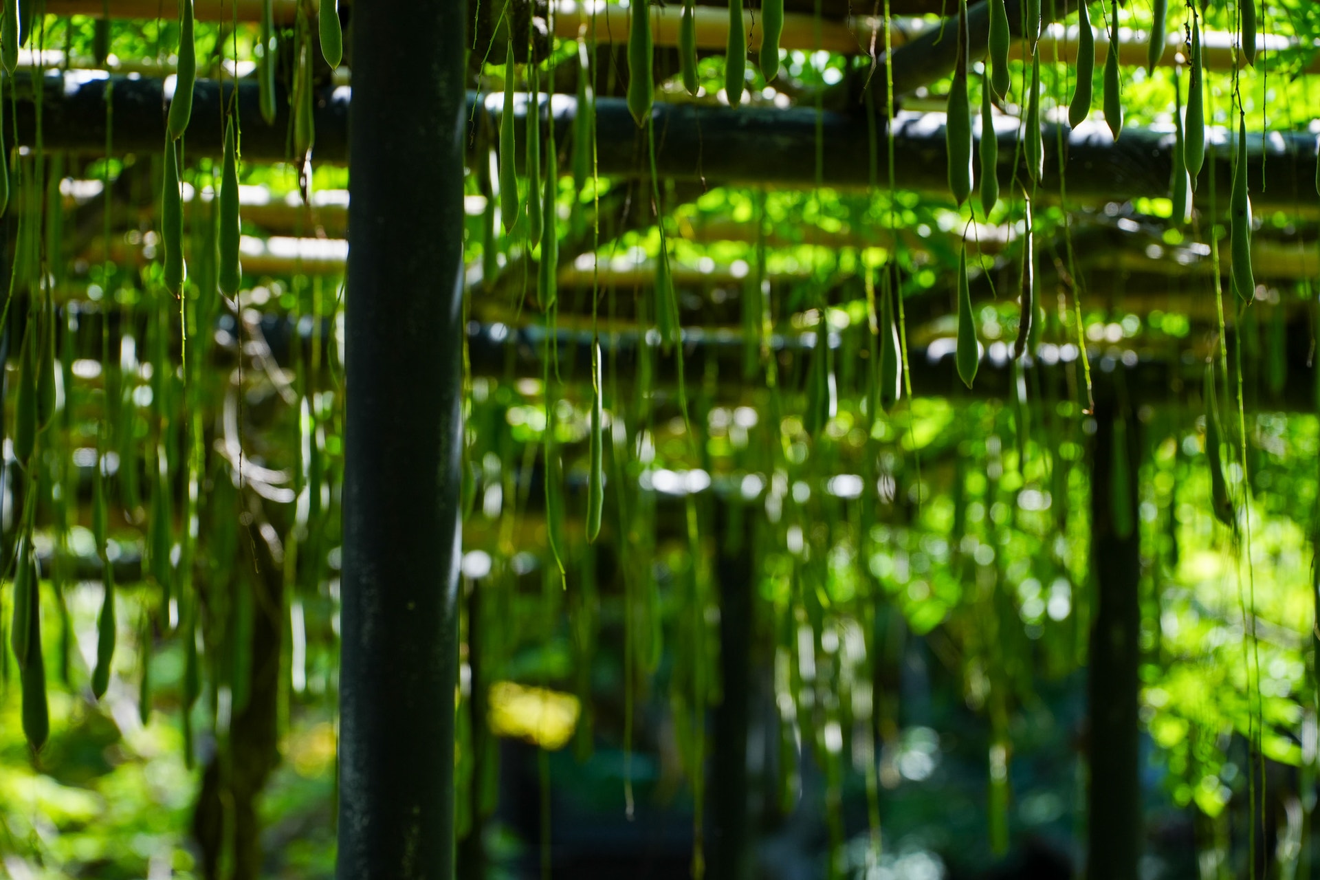 藤棚にたくさんの豆のようなものがぶら下がっていました。藤の実?