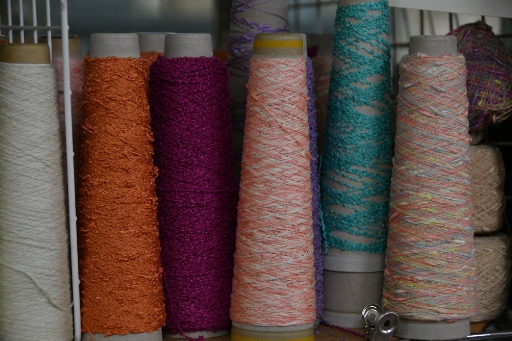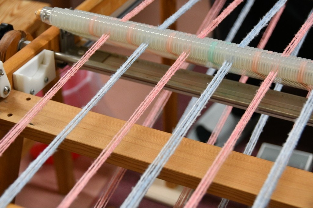 このピンクと水色の間に、マルチカラーの経糸をかけていきます。