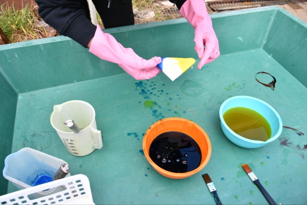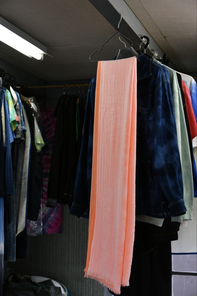 一つは、手ぬぐいを雪花絞りで染めるのと、あともう一つは、ストールをグラデーションに染めます。