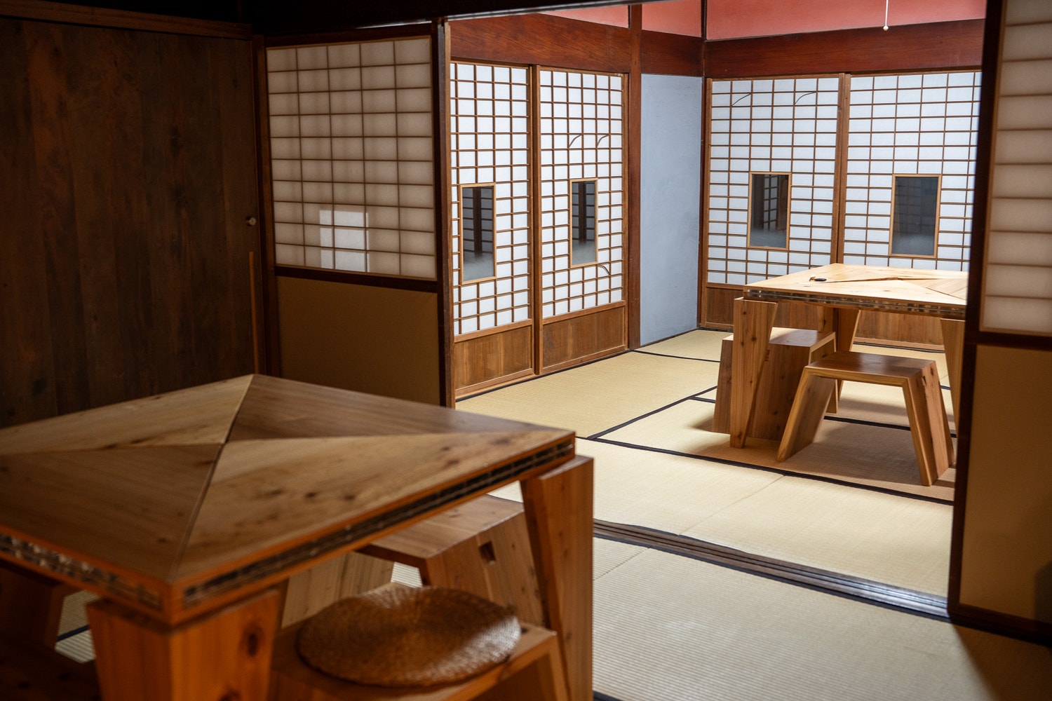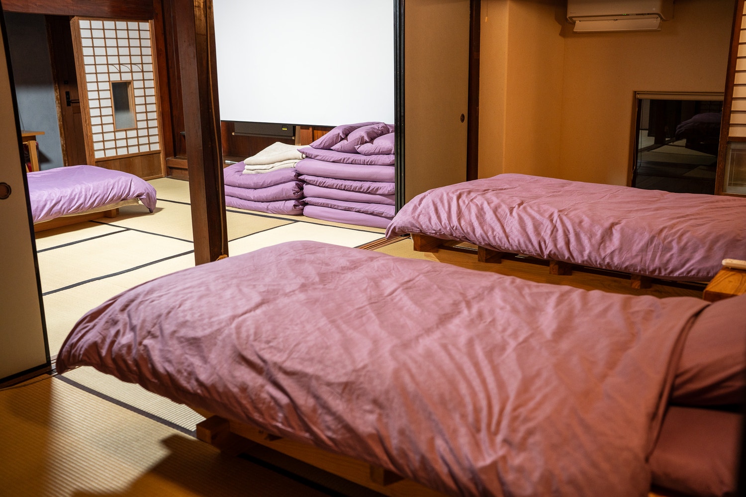 宿泊先の古民家。国の登録有形文化財にもなっている古民家をリノベーションした宿です。メインのスペースは8畳のお部屋が4つ田の字型に繋がっています。