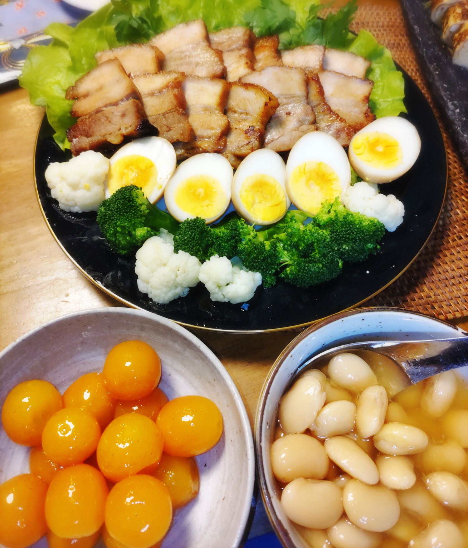 チャーシューと煮卵、金柑ハチミツ漬け、煮豆、昆布巻、2種類の松前漬(数の子、貝)、煮物を作る🔪