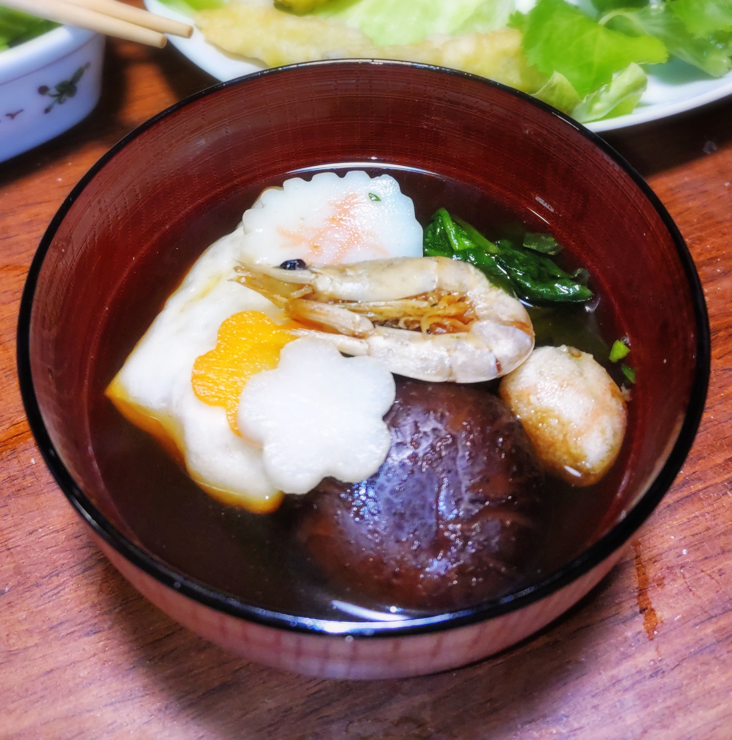 具材は気分で変わるけど、大体、四角い焼き餅の上に、型抜き野菜、麩鞠、ほうれん草、寿なると、椎茸、干し海老を載せて完成🤗