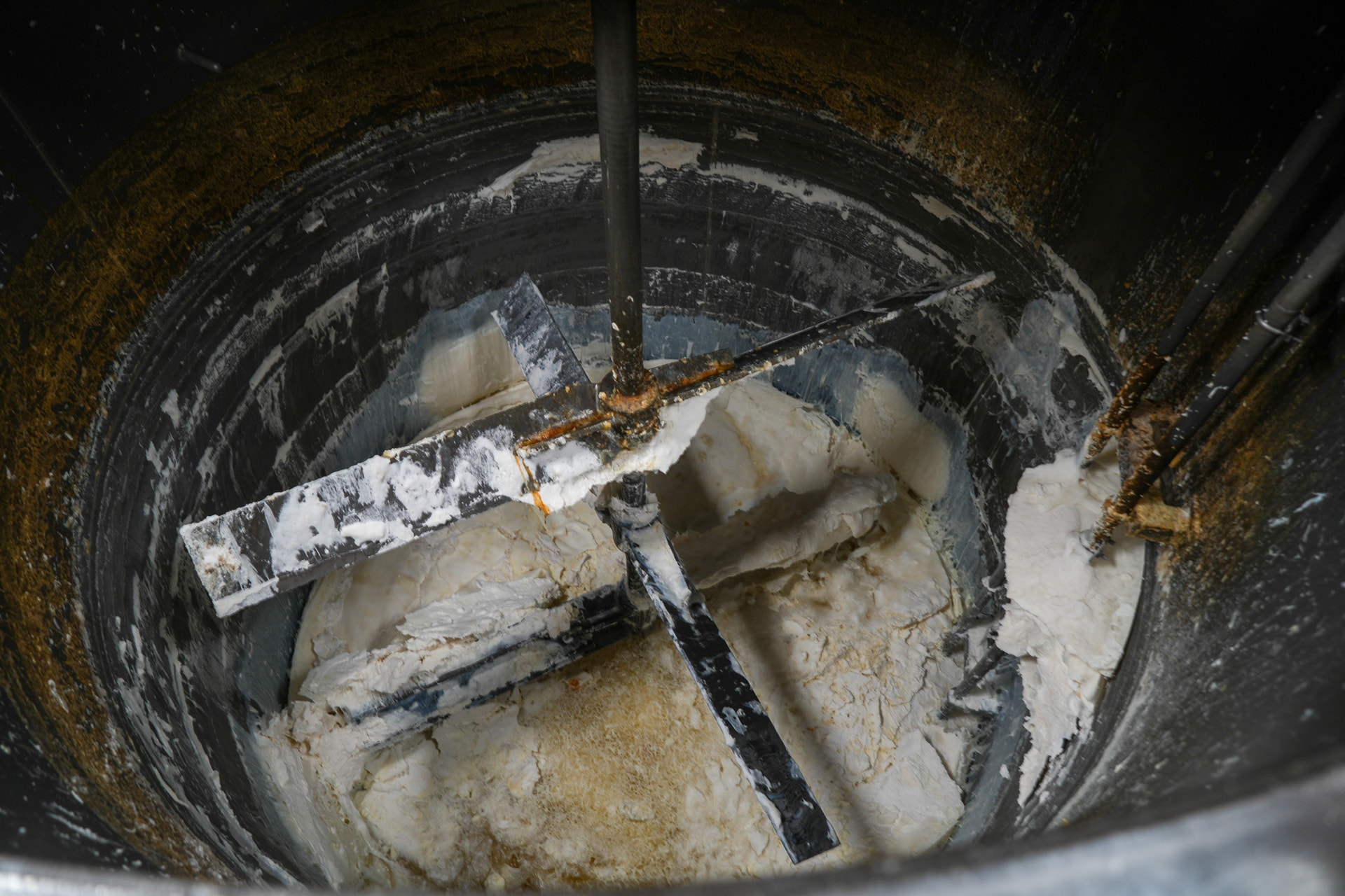 工場見学の日によって、見れる工程が違うそうです。今回は、石鹸の攪拌が終わって中身を移動した後でした。