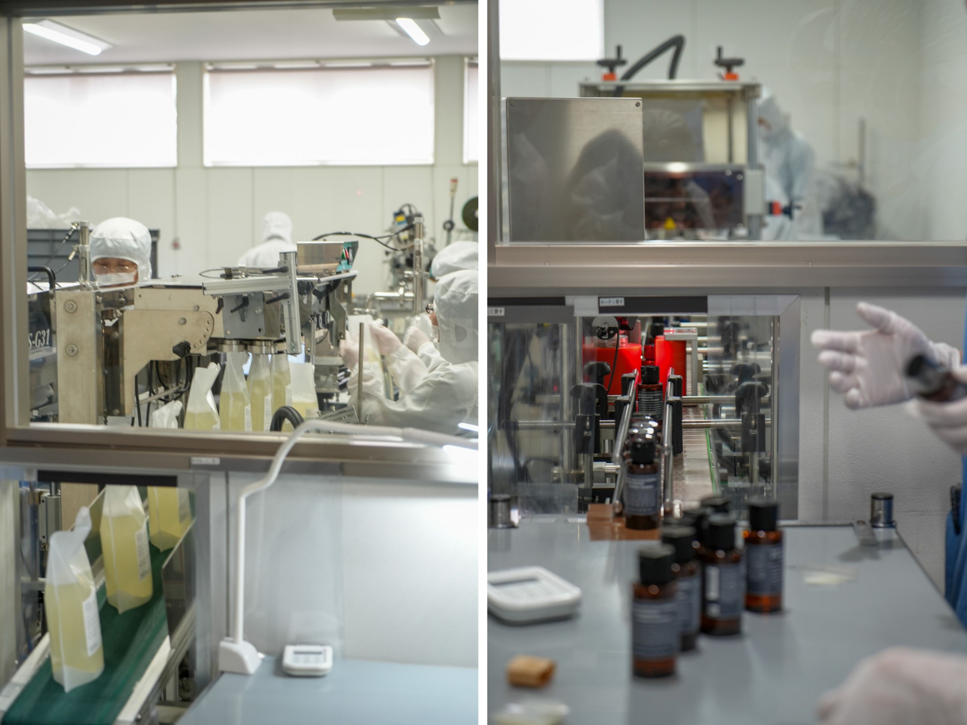 それは、商品数が多いので、一日の中で充填する商品や容量を変えることが多く、そのたびに洗浄や分解するには、大掛かりな機械より、手作業でできる小さな機械の方が向いている、と。