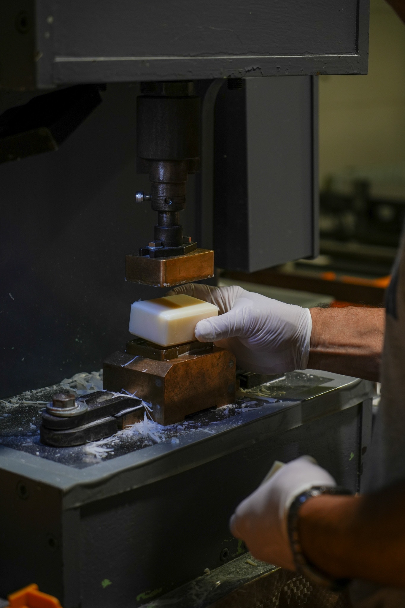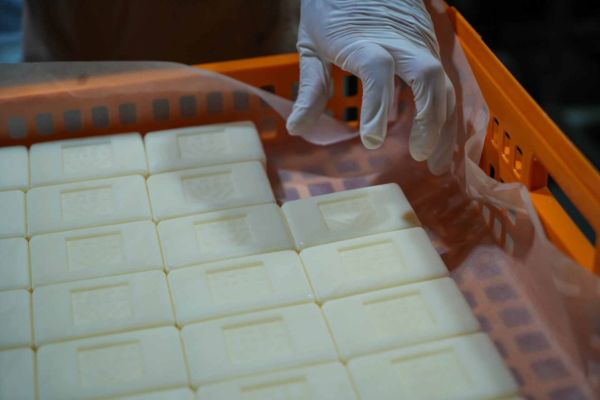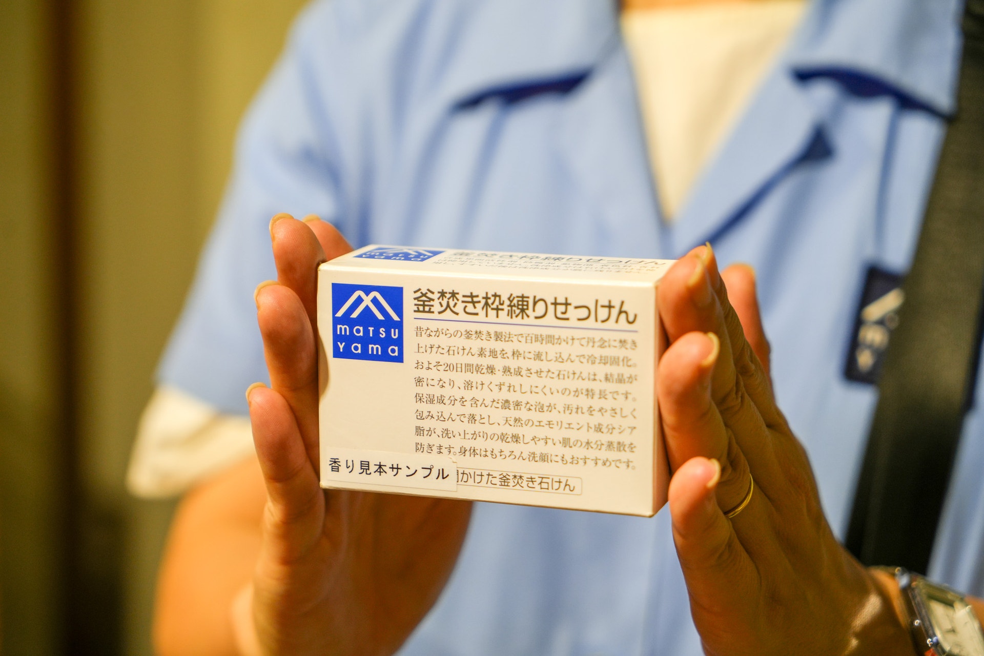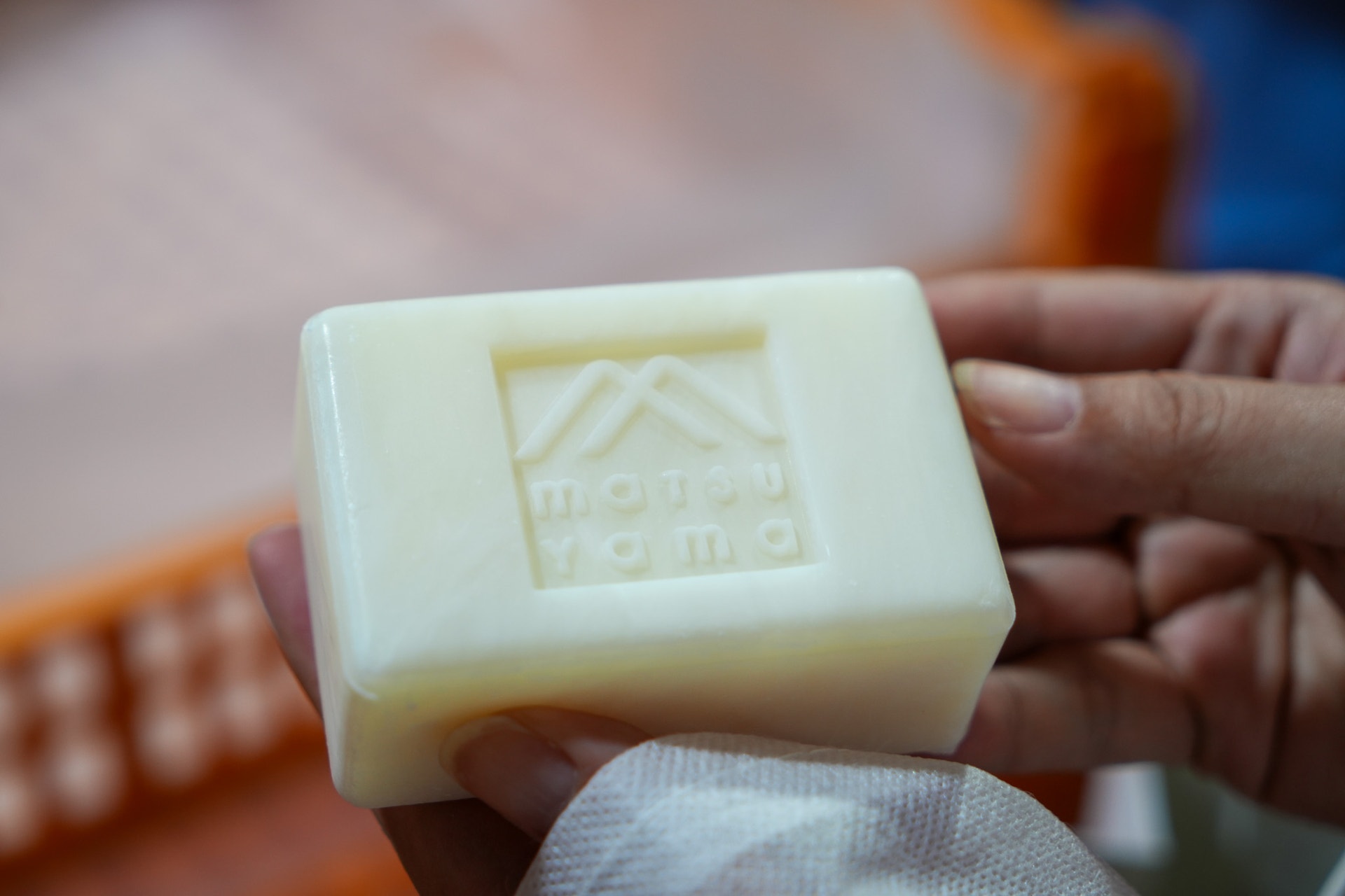 その後、少し乾燥させた石鹸に「松山油脂」の刻印をするところを見学。