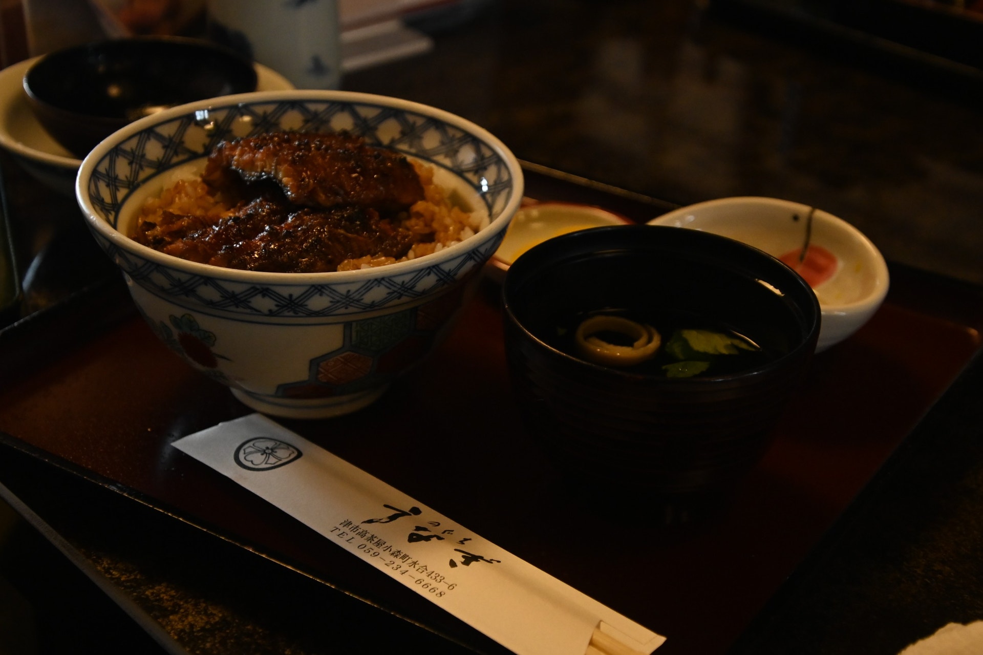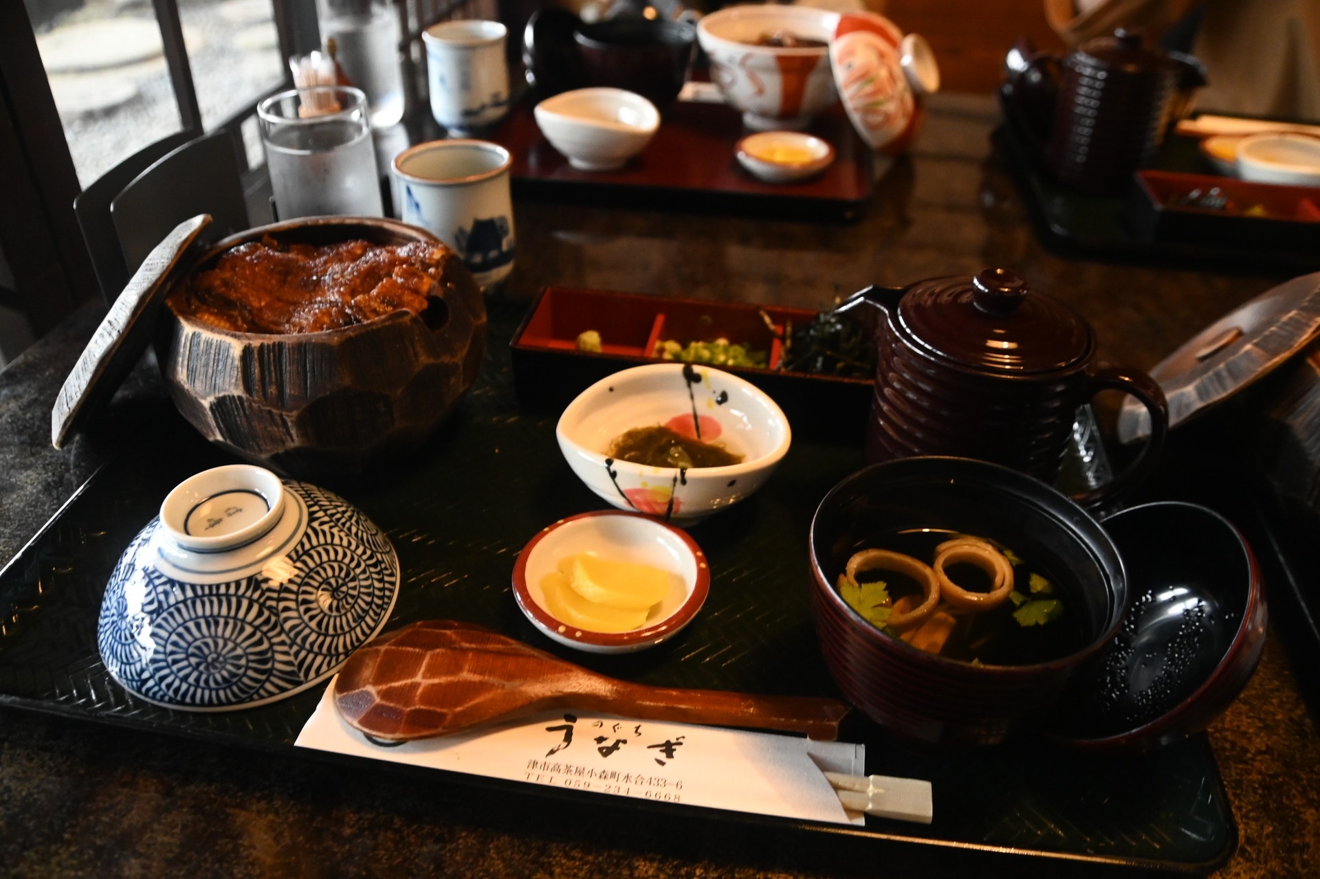 のぐちさんの建物は、岐阜県白川郷から移築されたもの。茅葺き屋根の店構えに、店内もとっても素敵。メニューも1400円のうな丼(小)から3700円のひつまぶしまで、幅広くあります。