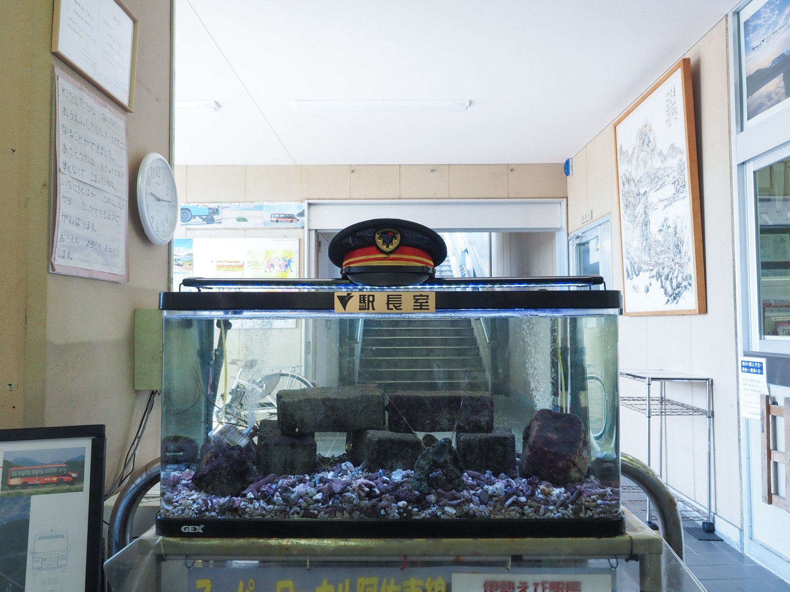 DMVを運行する阿佐海岸鉄道の本社があるのが、ここ宍喰駅。赤字から脱皮できるよう願いを込めて伊勢エビの駅長も見守っています。