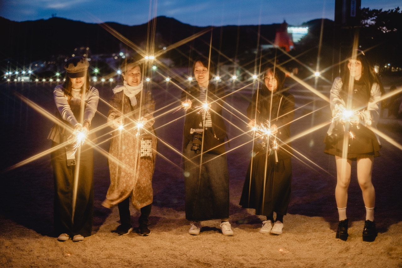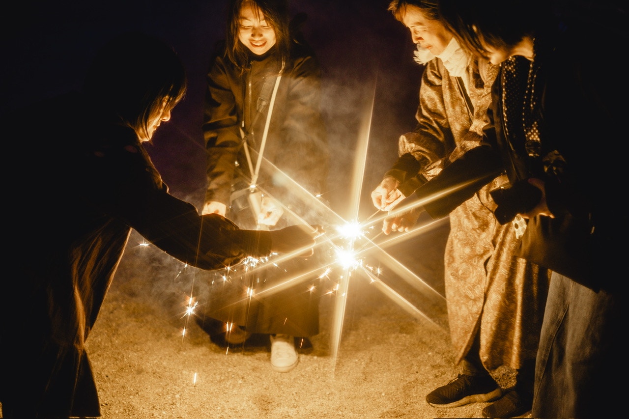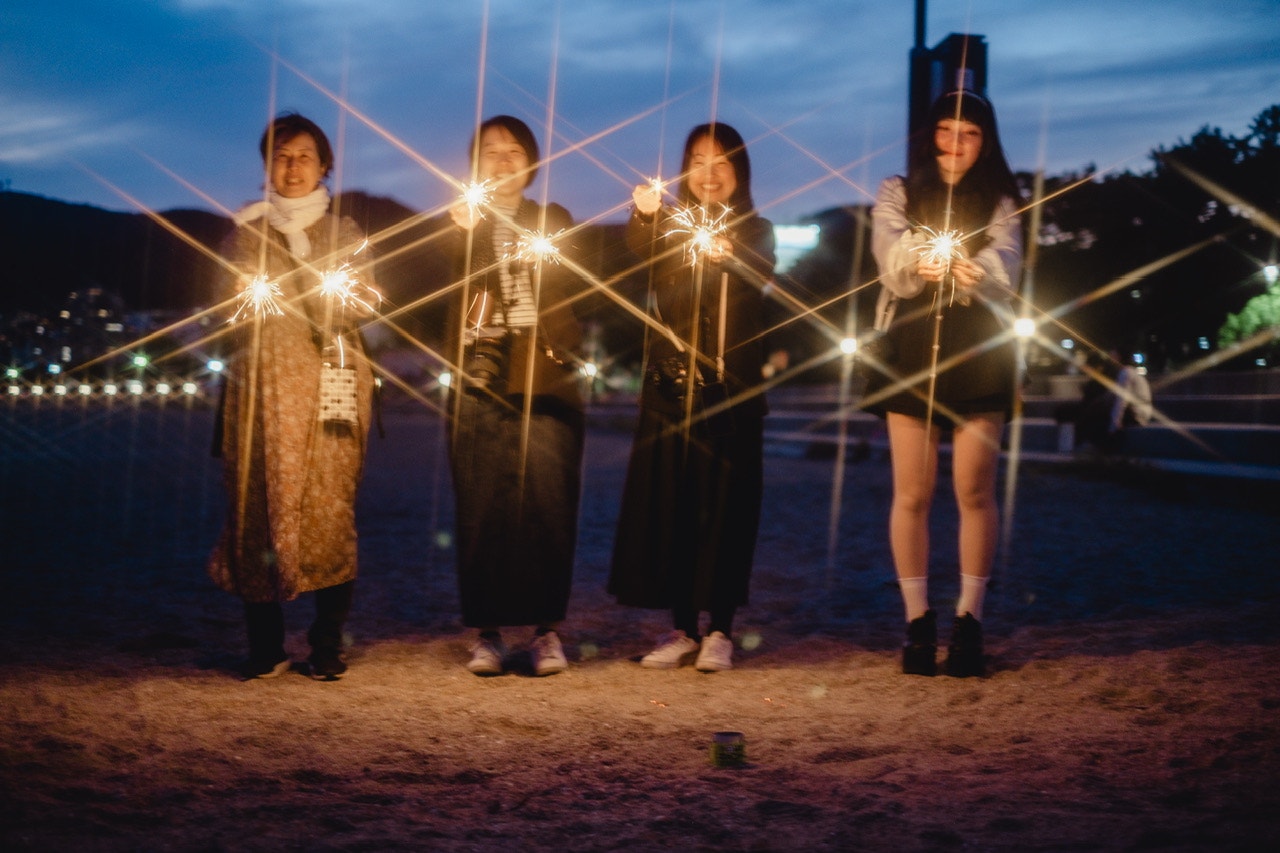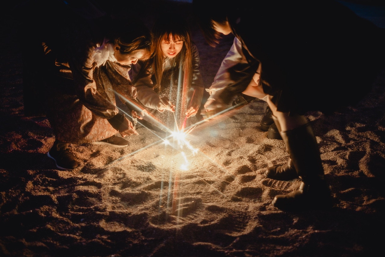 風で火がすぐ消えたり花火に点火しづらかったりしたから、みんなで丸く囲んでつけあったり💡