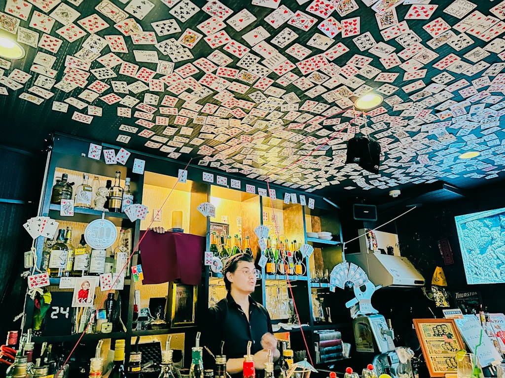 天井には名前入りのお客様のトランプがそこかしこに!