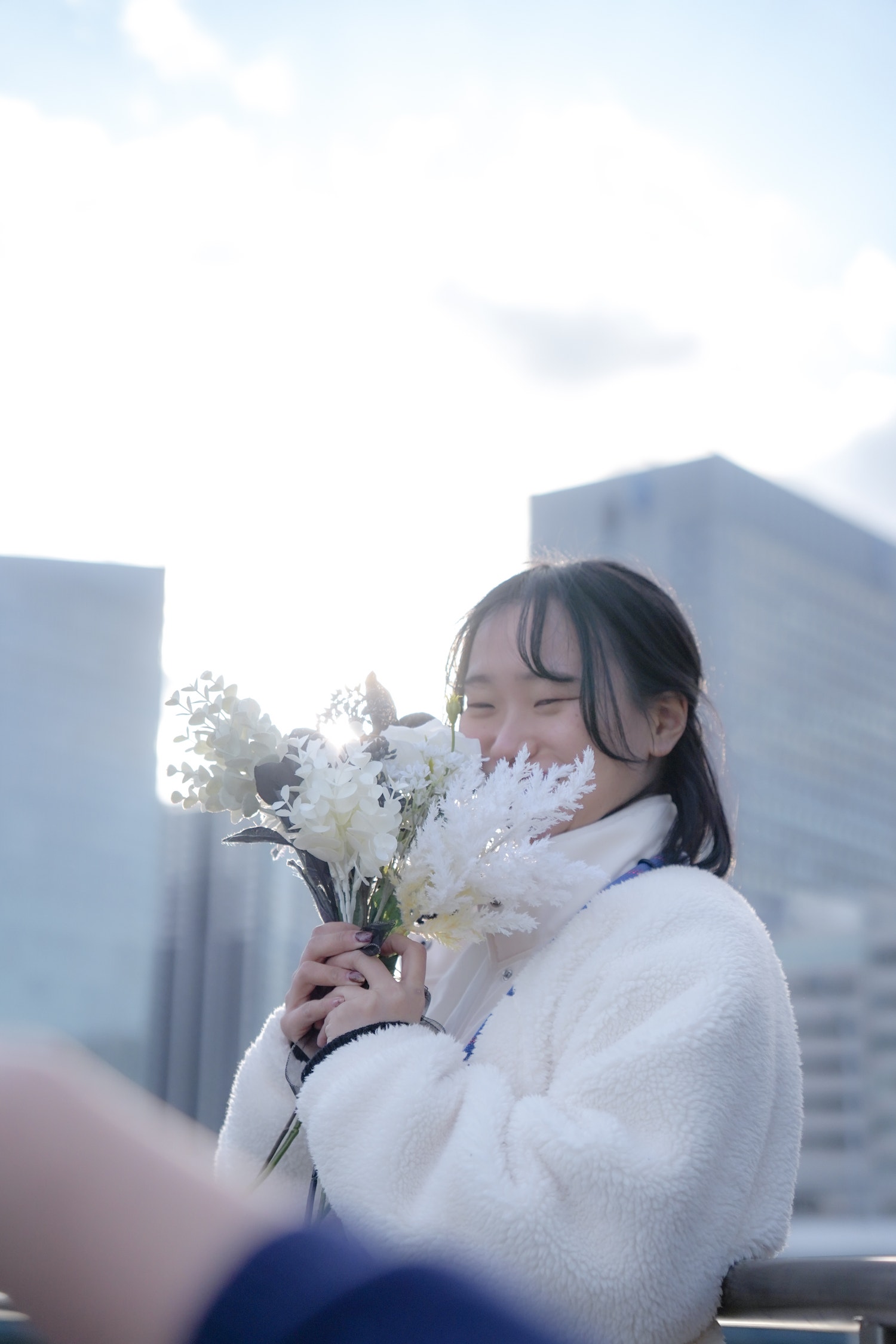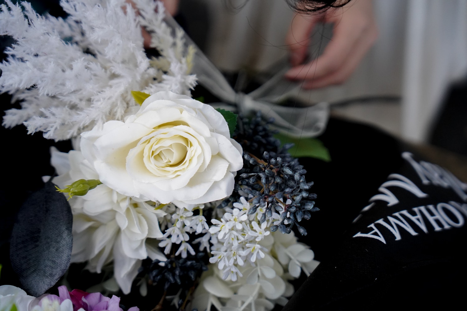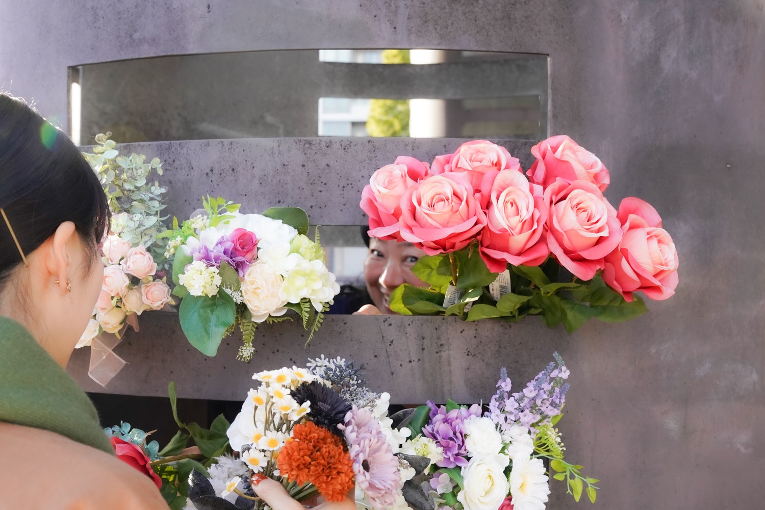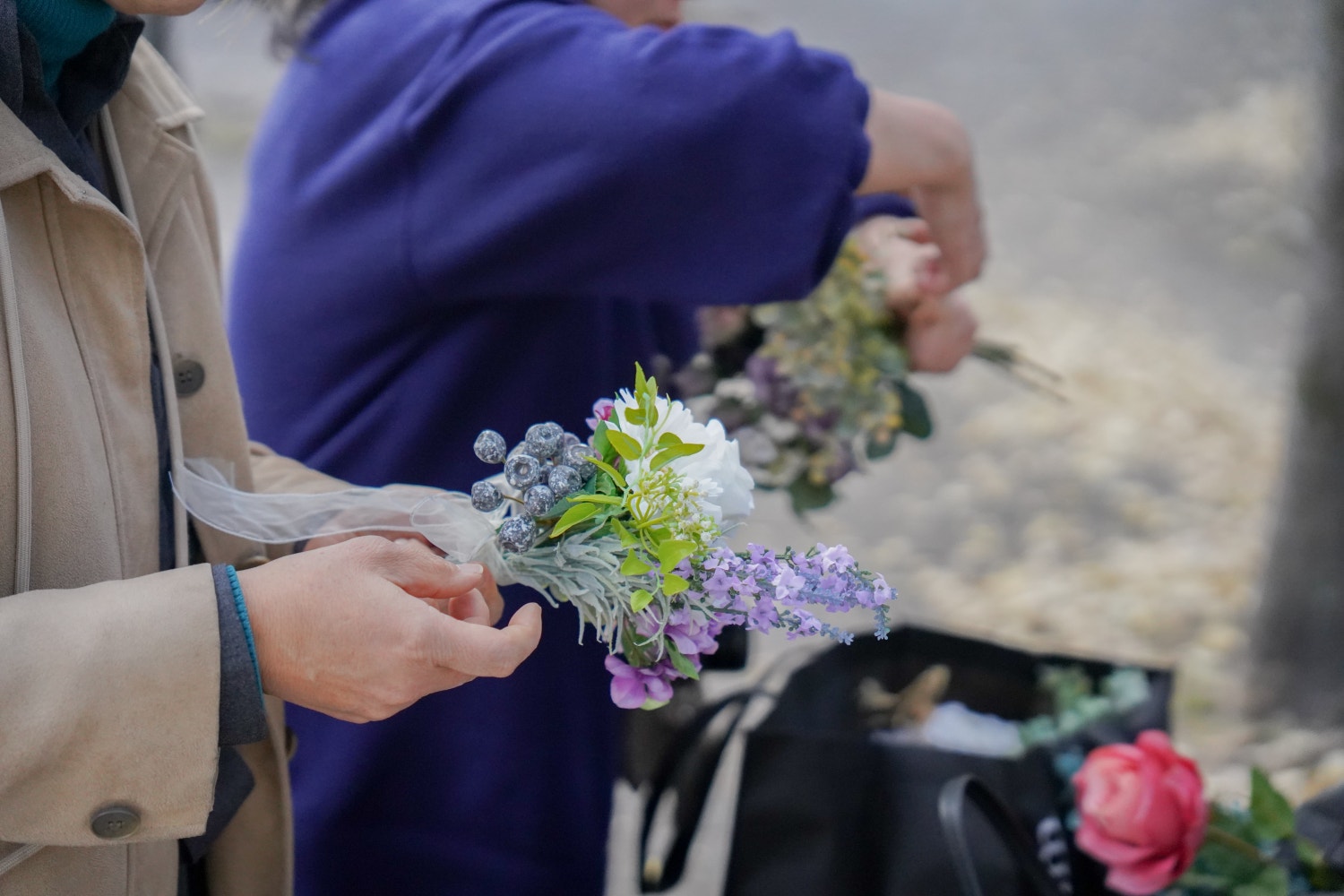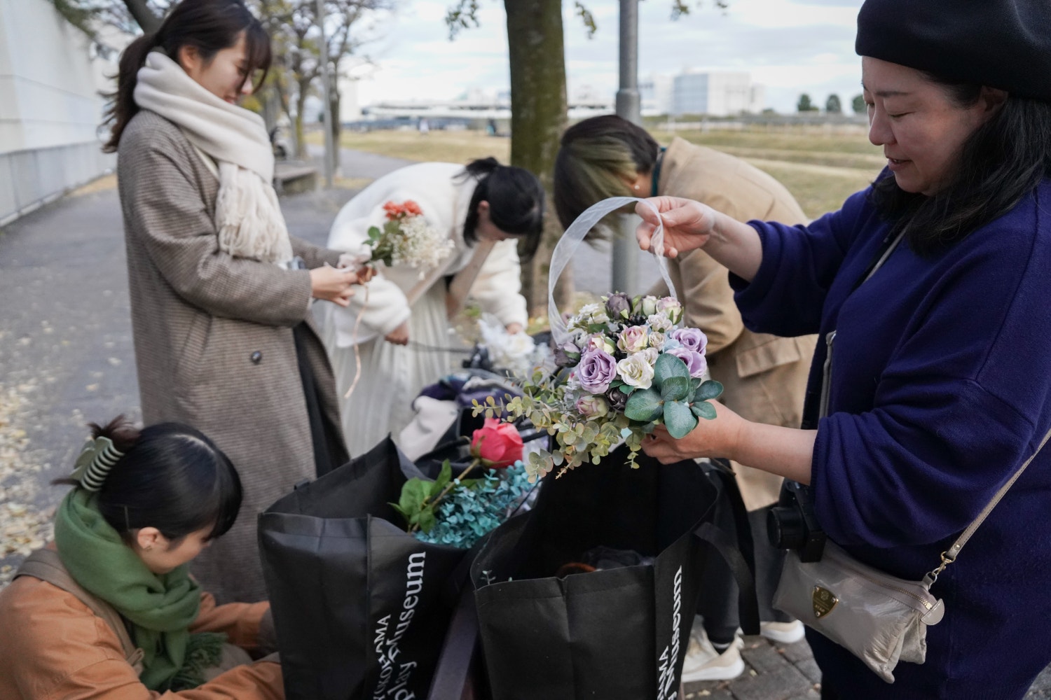 公園のベンチでタグを切ったり針金をほどいたりブーケを作ってみたり。みんなでわいわいあーでもないこーでもない言いながら作るのも楽しかった。