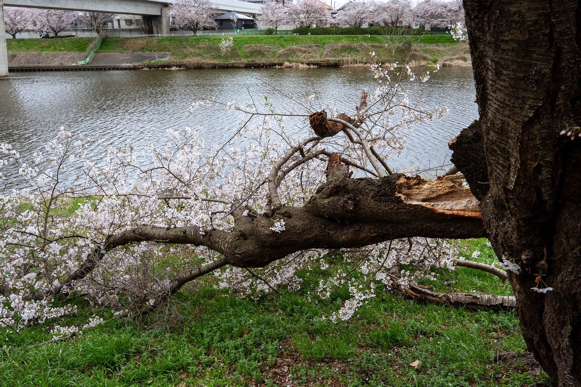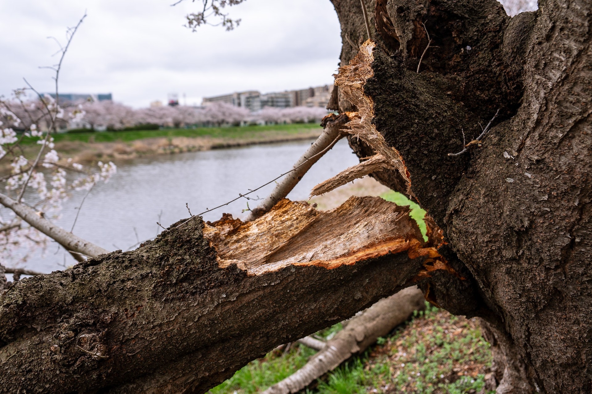 ここで衝撃的な場面に遭遇。折れた桜の枝。