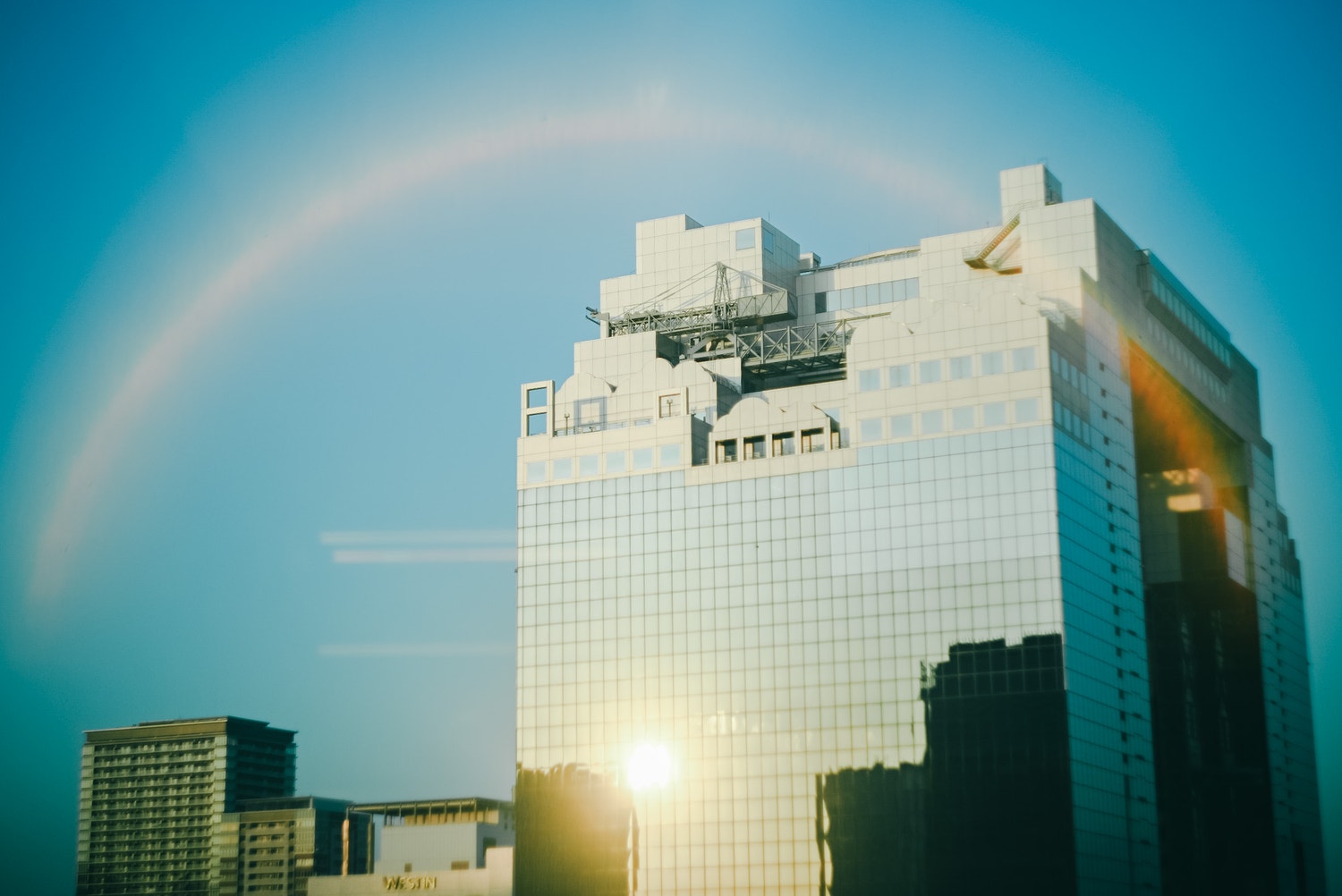 翌朝、朝日を浴びた梅田スカイビルには、光の架け橋が。