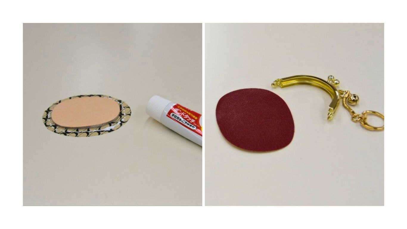 ボンドでのりしろを、キットに貼り付け、内側の革(えんじ色の革)と貼り付け、最後にがま口の金具を取り付けます。