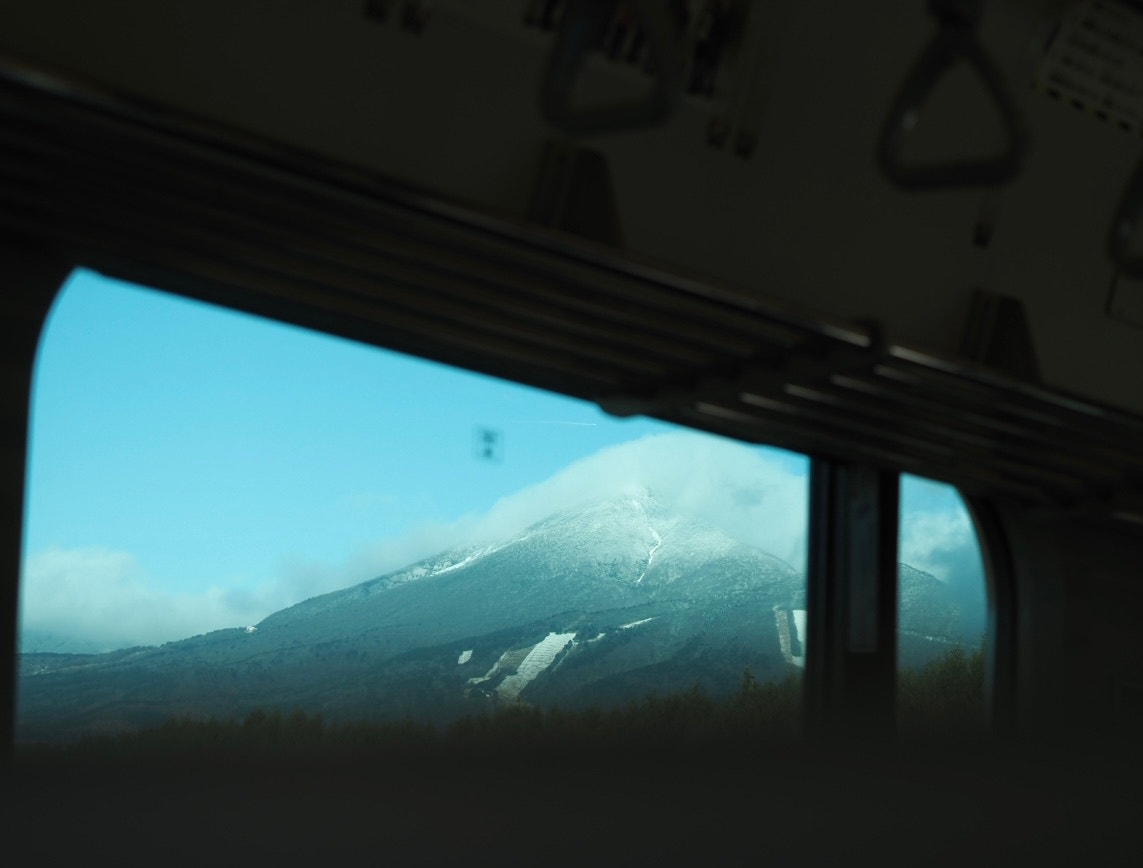 前日の移動は夜だったので気づきませんでしたが、雪を被った磐梯山が!