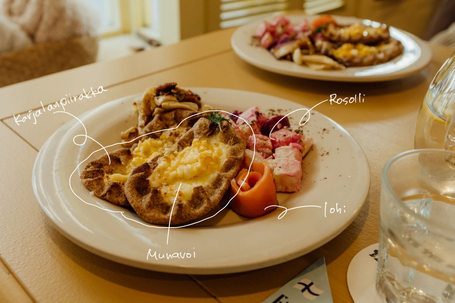 フィンランドのメジャーなキノコはカンタレリ(Kantarelli)で金色のアンズタケですが、今回出てきたのは違うキノコのようでした。スープの素なんかもスーパーで売ってたりしますよ。サーモン(ロヒ/lohi)も乗ってたりして、フィンランドのメジャーな食べものばかりでした✨