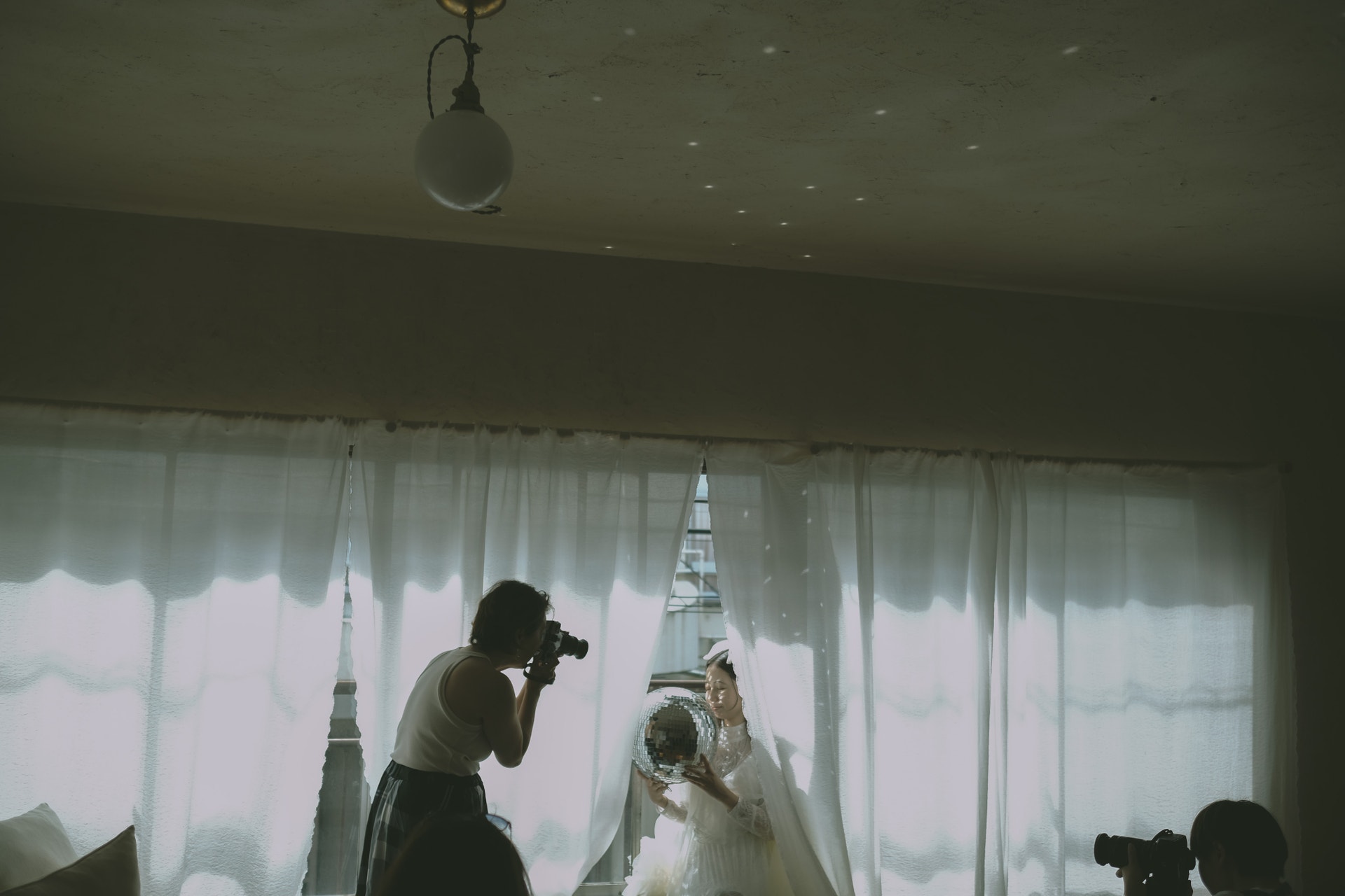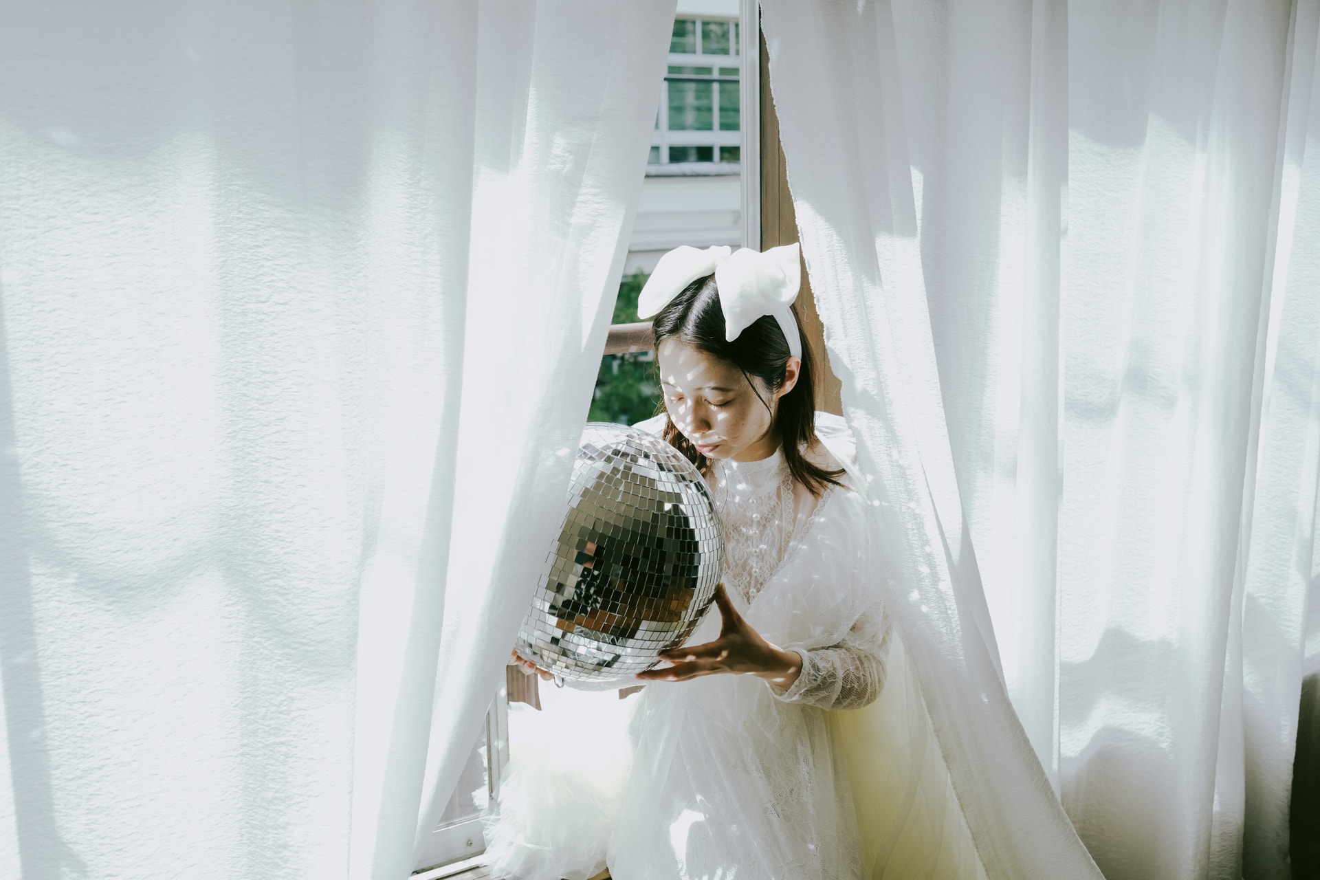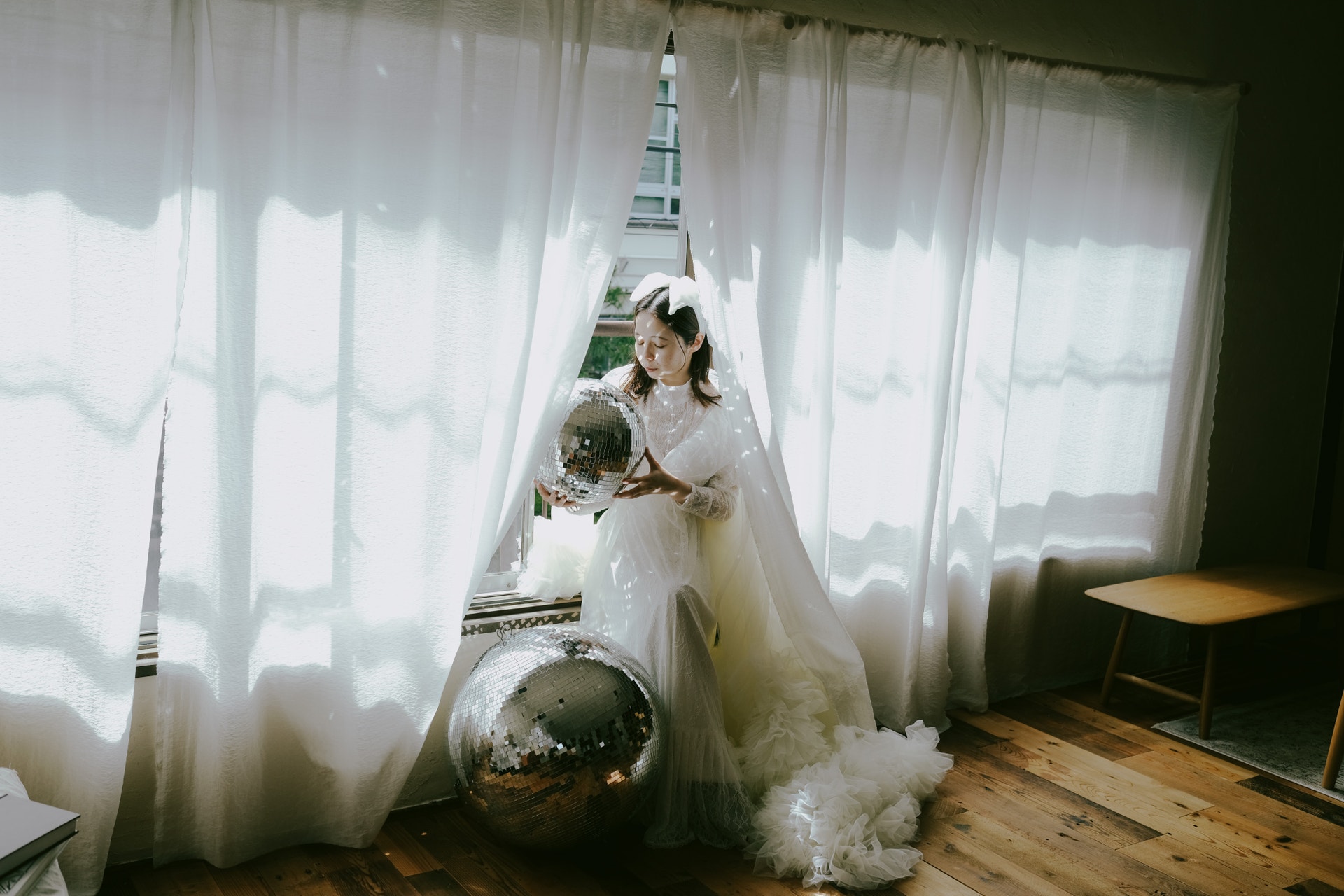 天気が怪しかったですが、少し日が差したのでミラーボールなんかも使ってみました。モーリーが被写体役として活躍してくれました!
