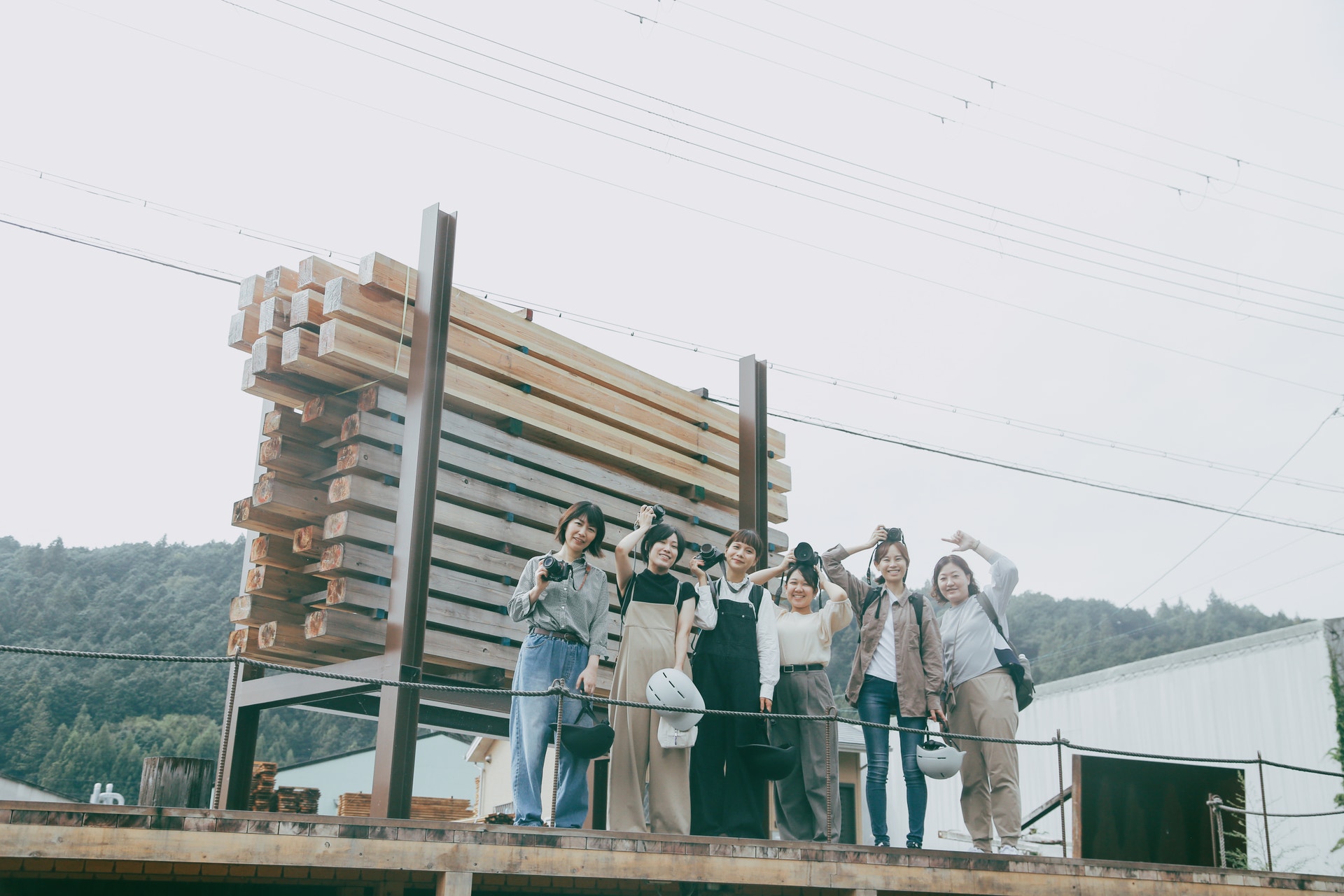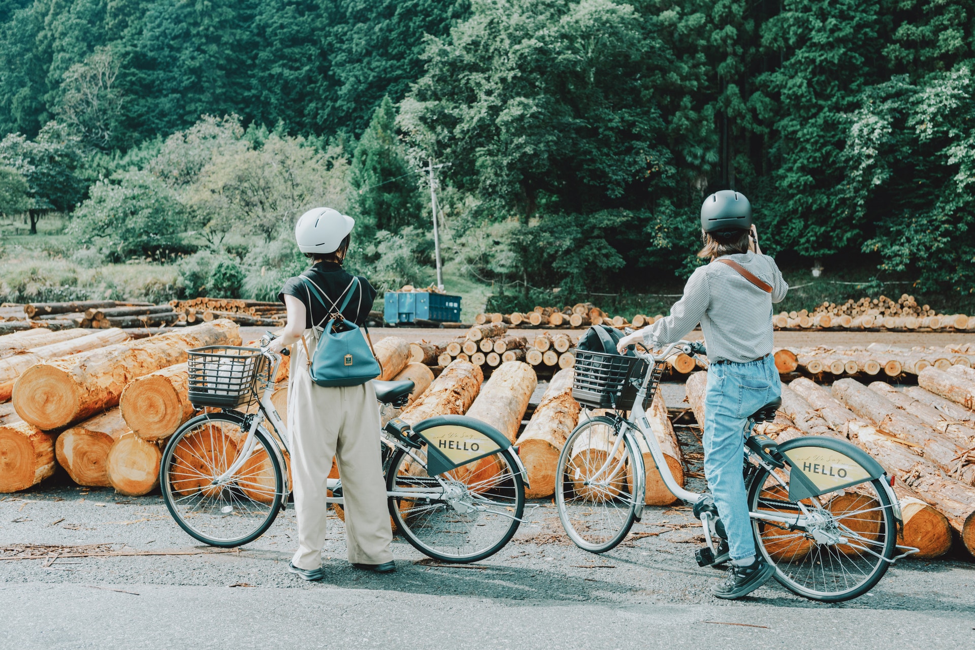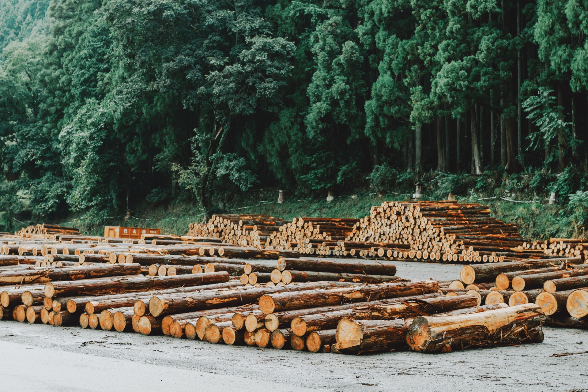 道沿いに突如現れる、ずらりと積まれた木材の山。結構長い距離で、大きな木が広く並ぶ風景に、これは私たちにとっては非日常だなぁとじわじわ感じます。