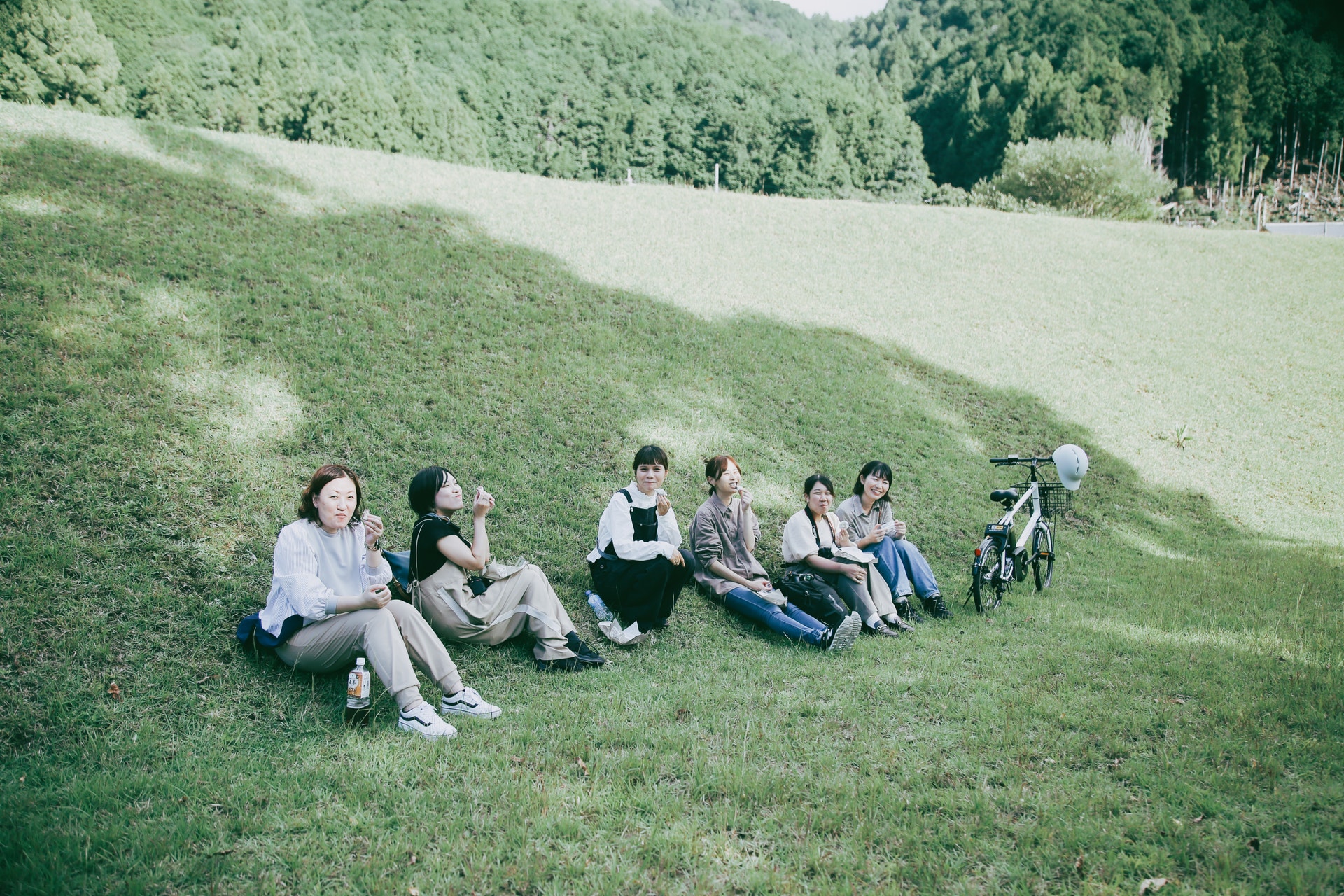 こばし餅店でテイクアウトしていた、焼き餅をおやつにひと休み。神社の入り口近くに原っぱがあるんですよと近鉄の方に教えていただいて、そこでおやつタイム。原っぱの木陰になっているところで腰を下ろしました。サイクリン後の焼き餅、美味しかったです!