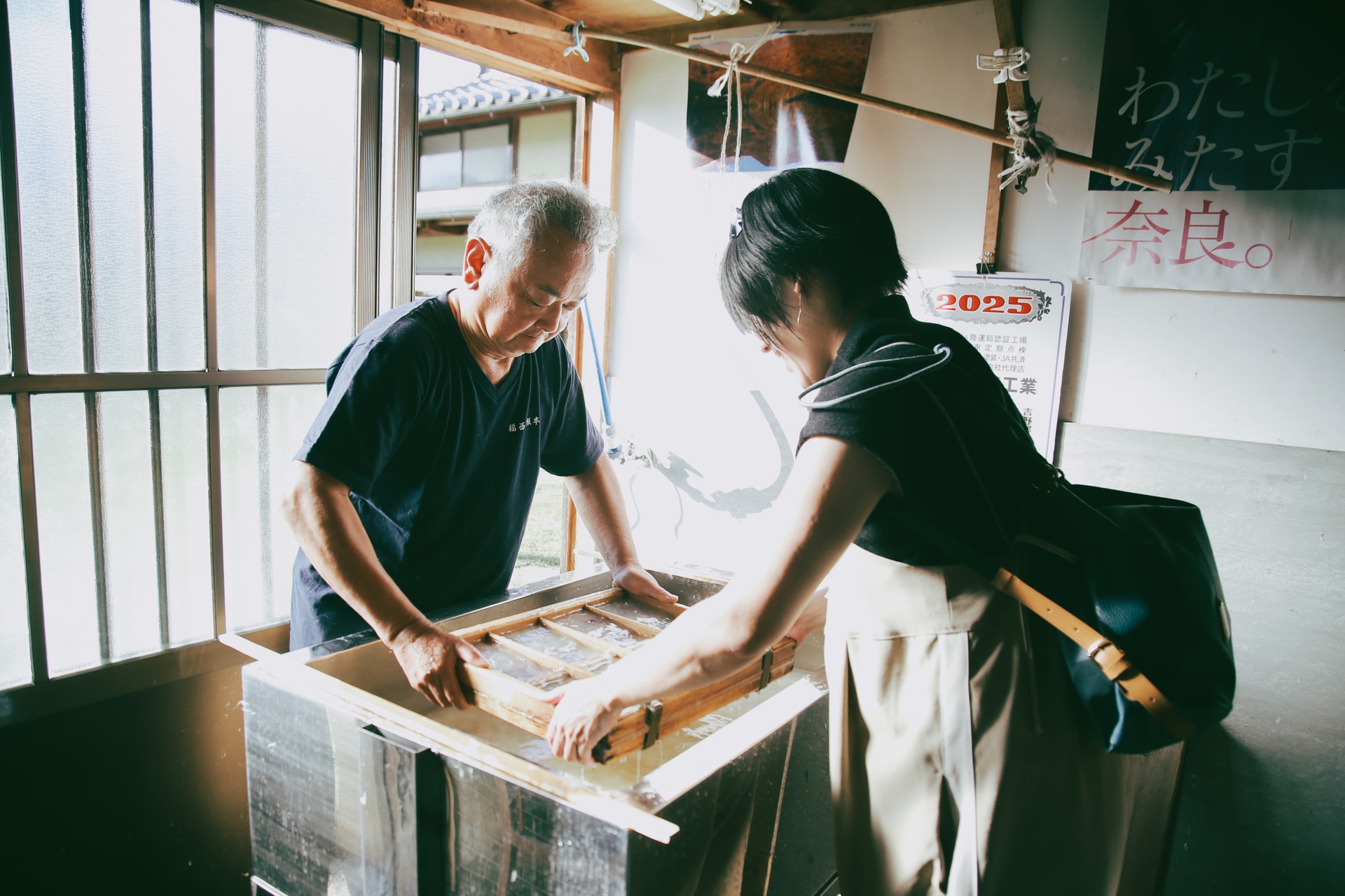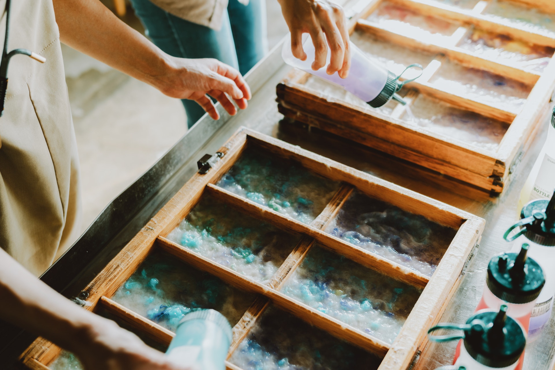 さらに坂を上った先にある「福西和紙本舗」で、和紙づくり験も。店主のお父さんに手際よく教えてもらいながら、自分の好みで色を重ねて、オリジナルの和紙が完成します。完成した和紙は後日みんなの手元へ届きました。