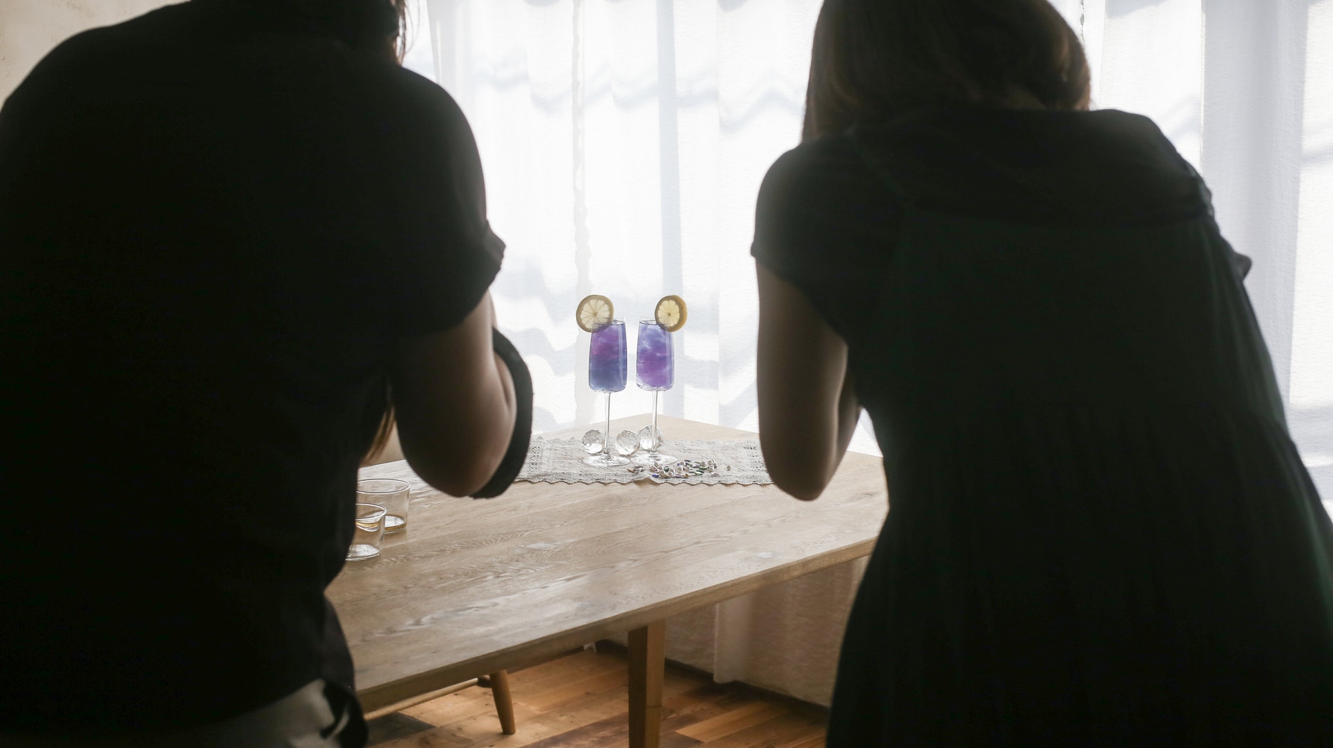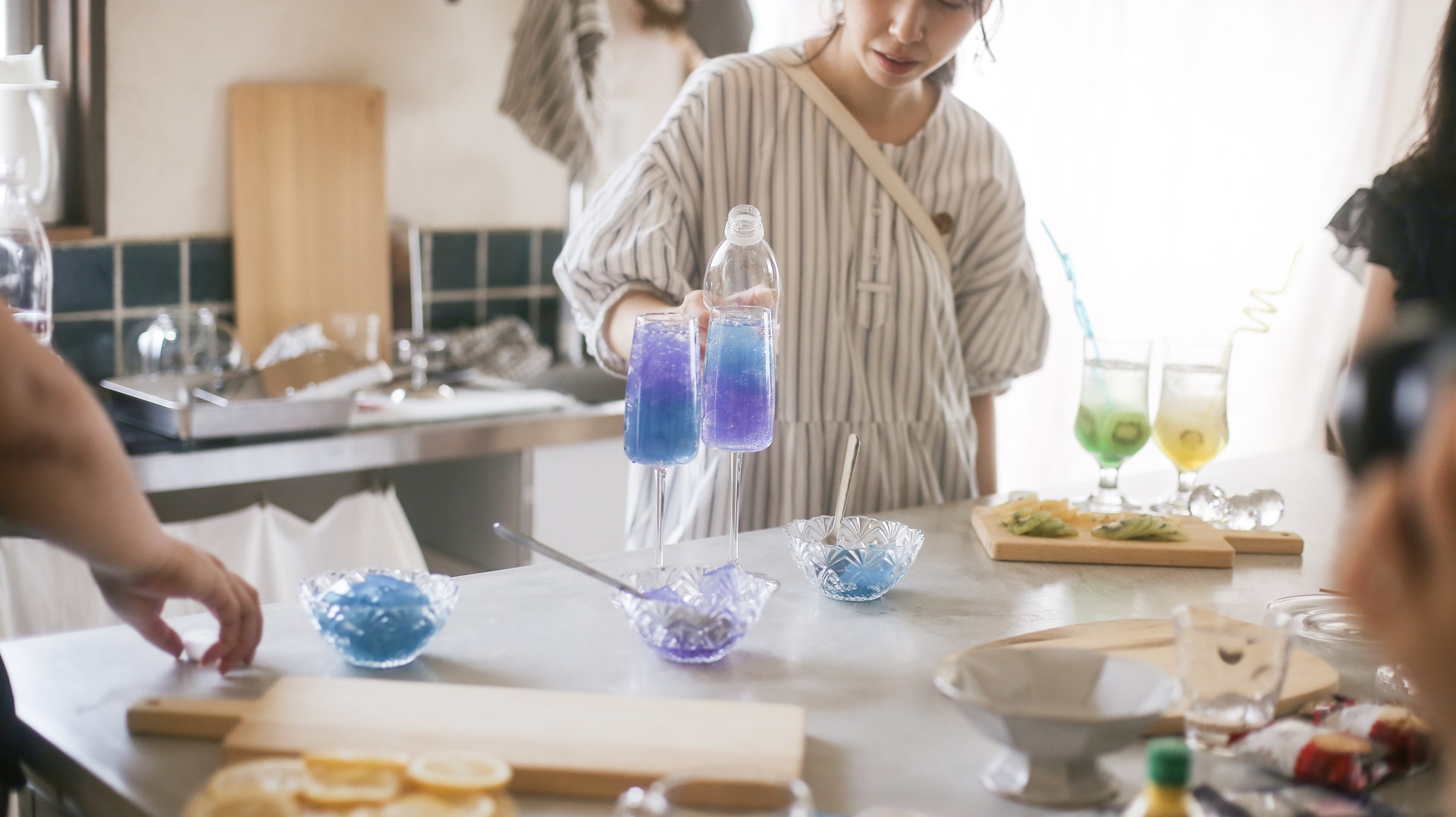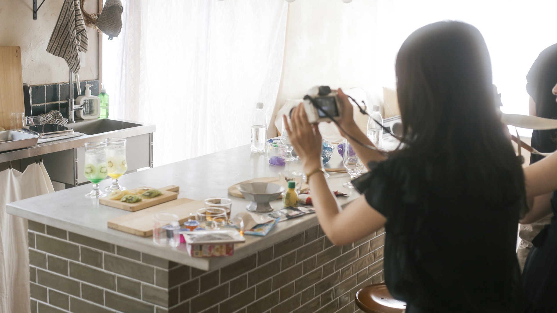 ゼリーソーダ、琥珀糖ソーダ、フルーツソーダが完成したタイミングで撮影タイムに。自由にセッティングしてもらいながら撮っていました! @さきとぅん さんが持ってきてくれた、キラキラストーンやテーブルクロスをセッティングしてくれて、より透明感ある雰囲気になっていました✨ 手持ち撮影など、@sami さんが指示出しもしてくれて撮りあっていました☺️