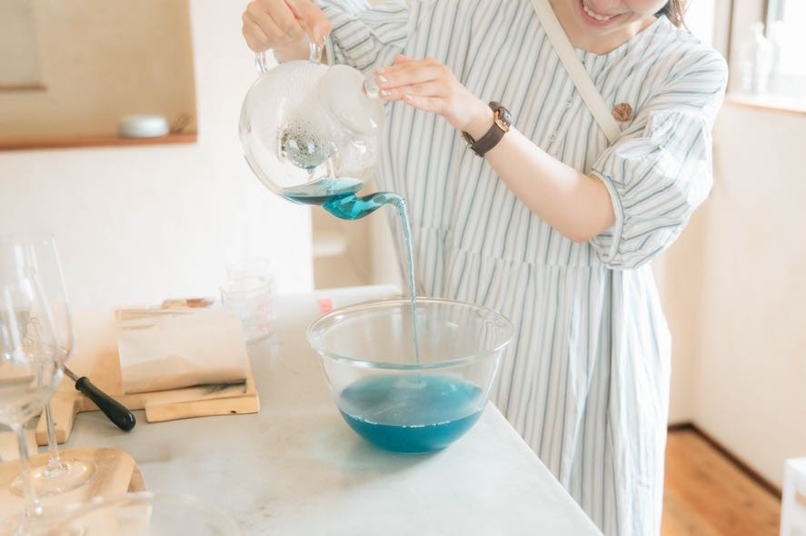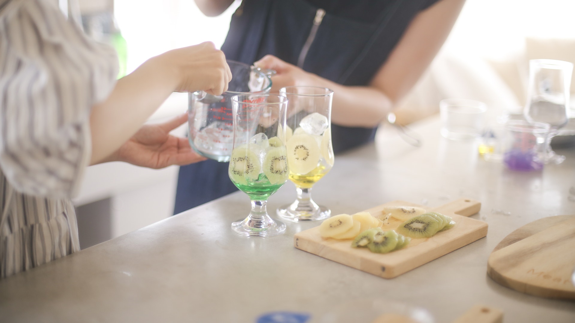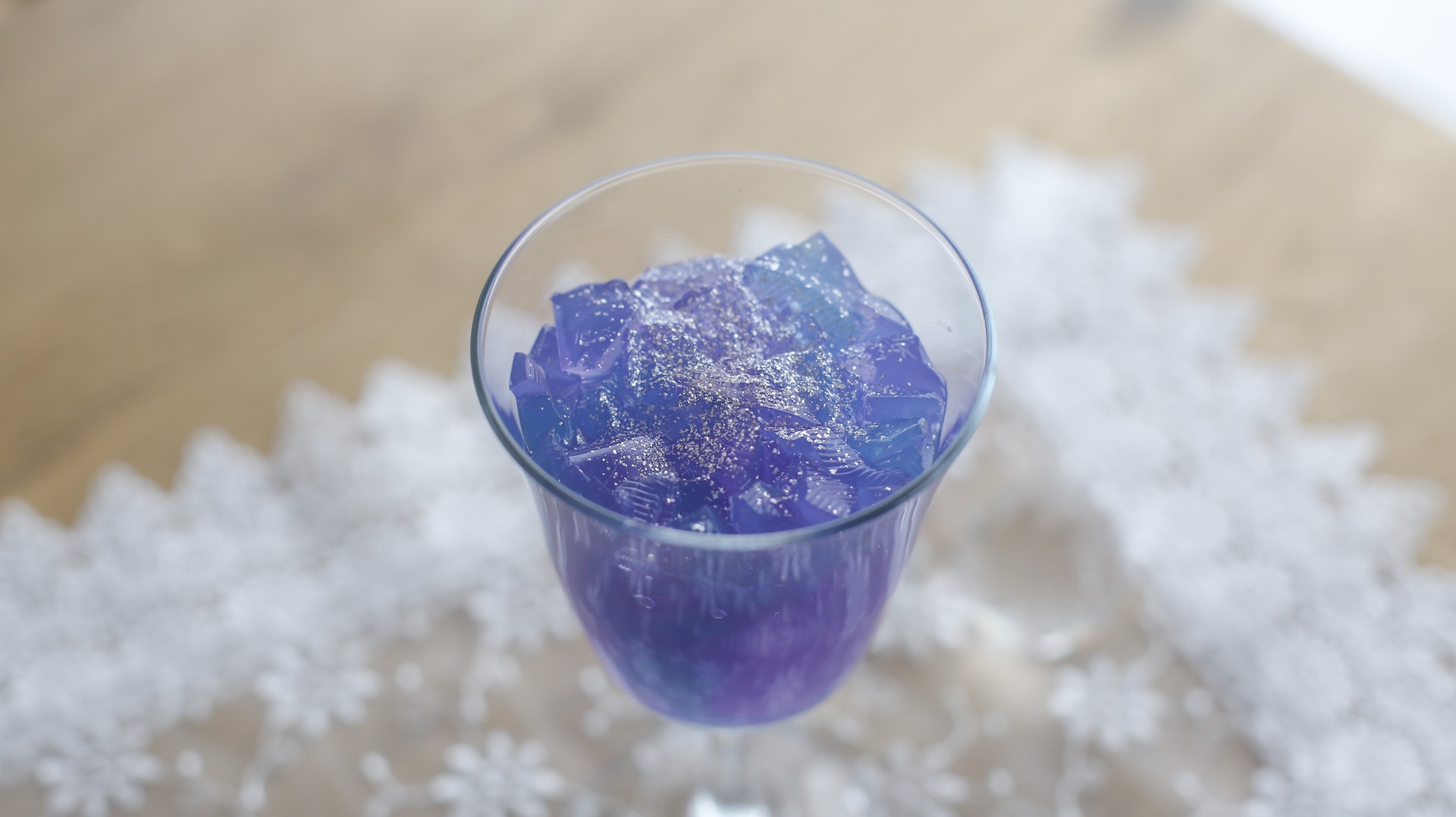 かためる時間が必要なゼリー作りからスタート!第1回の紫陽花スイーツのバタフライピーを活用しました!今回はドリンクに入れるため、大きめにカット。かんてんクック顆粒を使ったレシピページを @のぞみん さんが教えてくれて、なんと15分程でかたまるらしい!とのことで使ってみました!冷蔵庫に入れていたら、いつの間にかかたまっていました😳