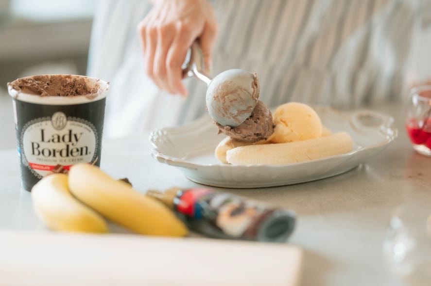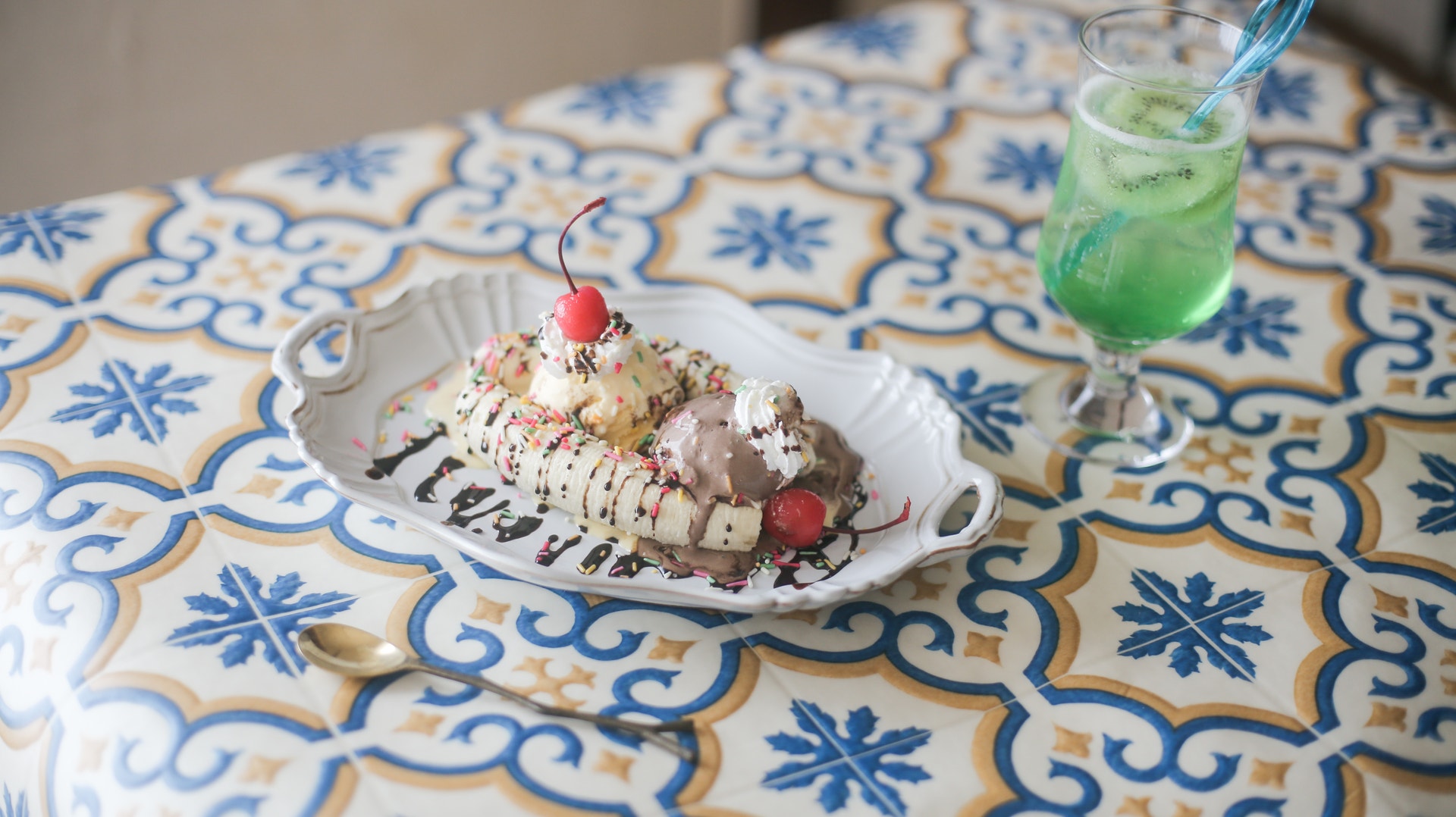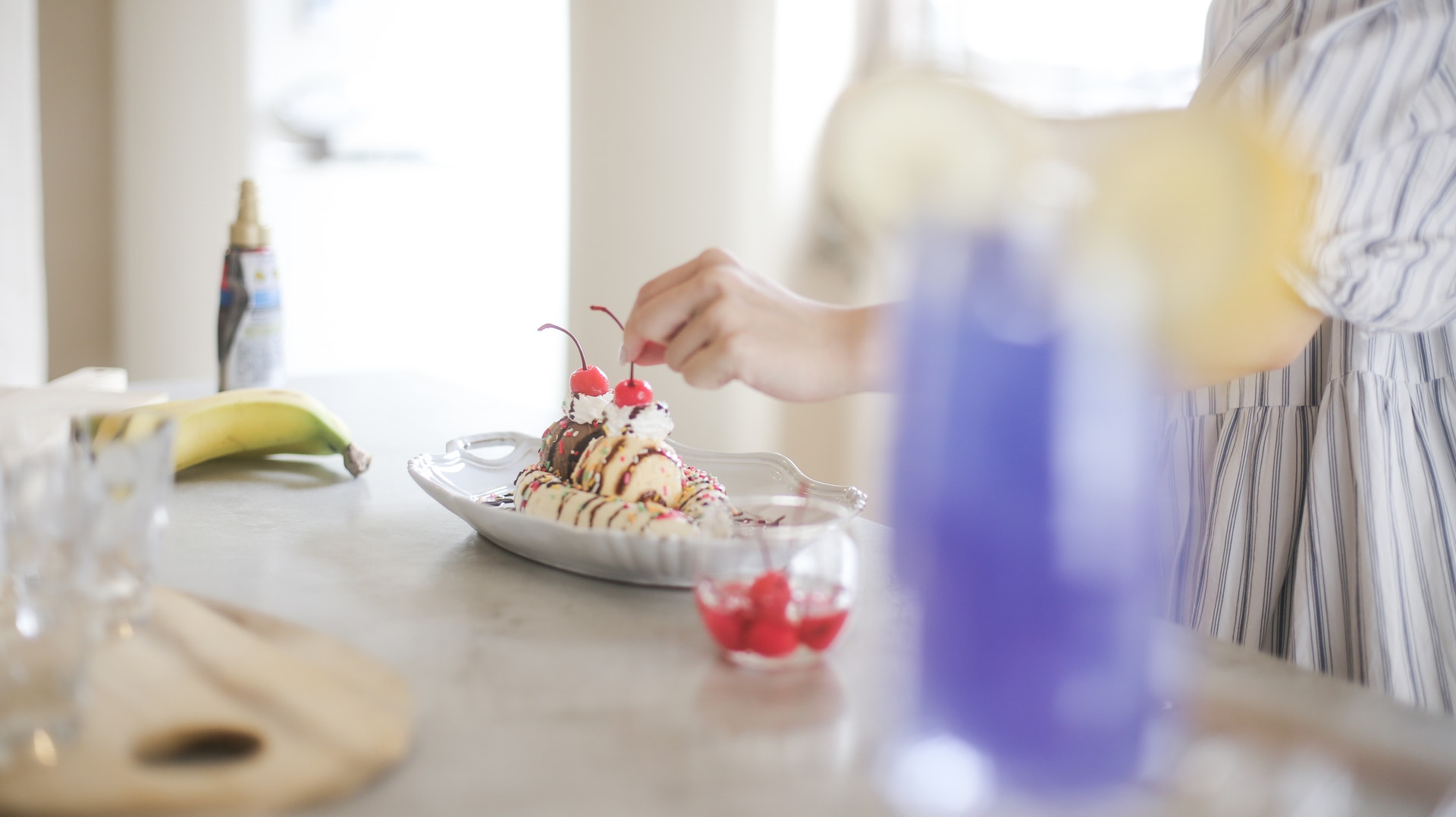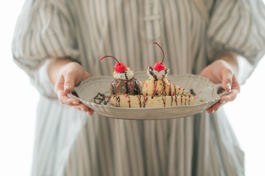 材料:バナナ・ホイップ・アイス・さくらんぼ・チョコソース・カラフルスプレー