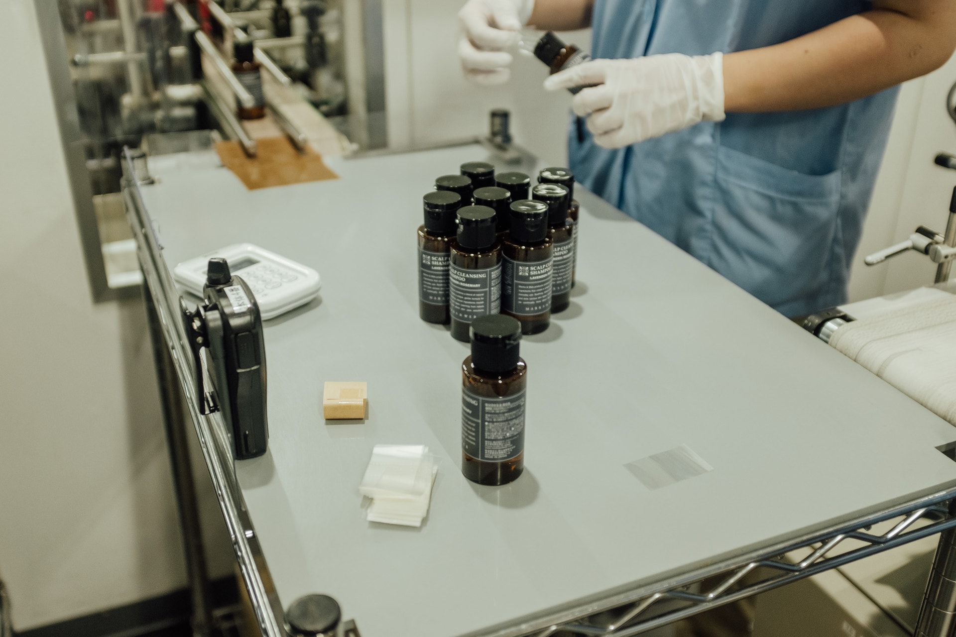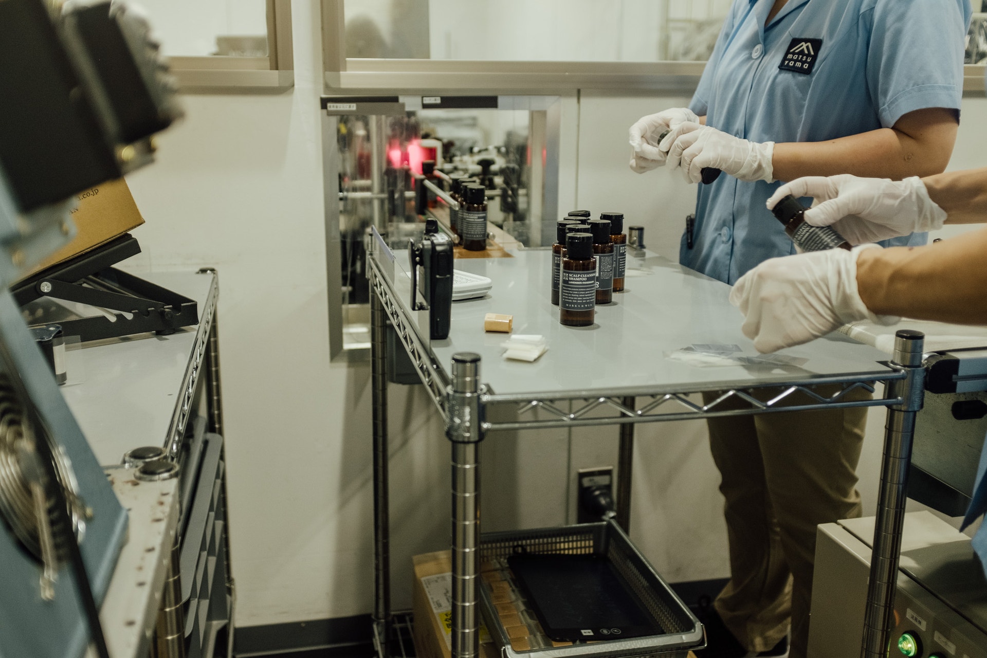 例えば小瓶充填作業は「無香料」「ラベンダー」「レモン」を同じレーンで作ることができる、小回りが効く動き方なんですね。(他の種類に変える作業も協力しあってあっという間に清掃から再充填までセットできちゃうそうですよ!)